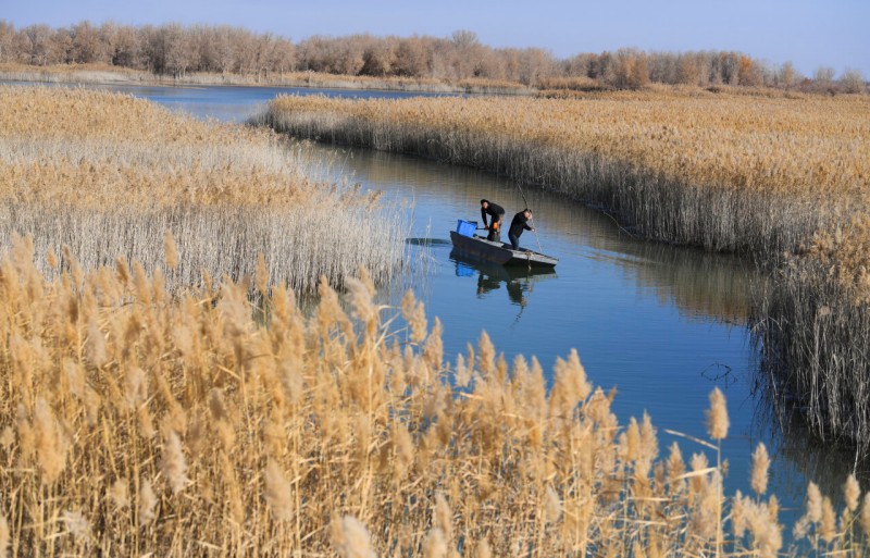 工作人员在策勒县沙海玉湖下网捕捞螃蟹。汤永 摄
