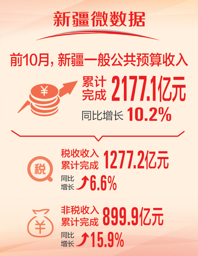 前10月新疆一般公共预算收入超2177亿元 增幅居全国第三