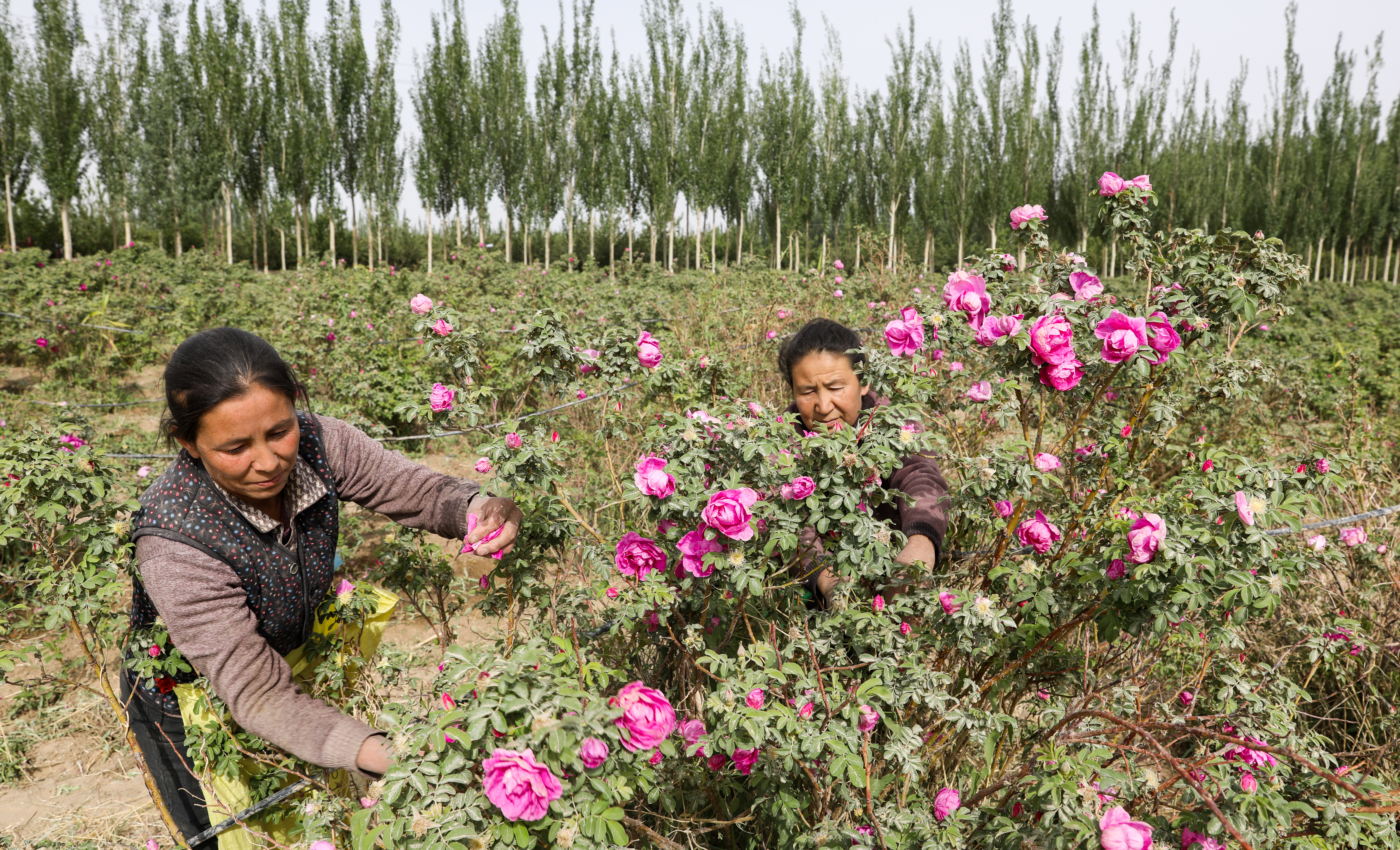 花农在于田县奥依托格拉克乡的瑰觅特色玫瑰种植基地采摘玫瑰花。许晓龙 摄
