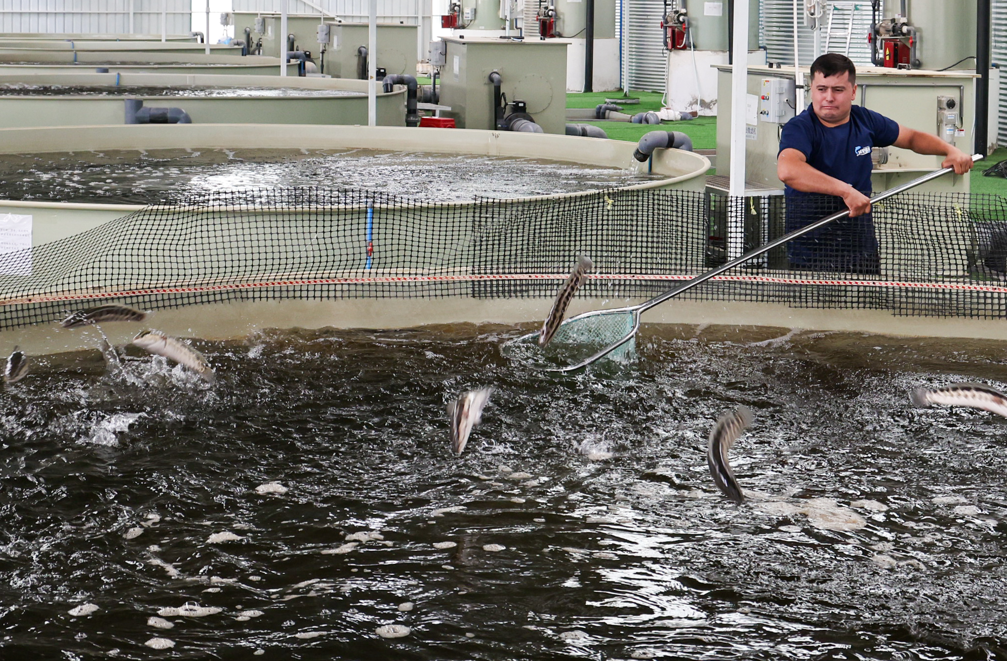 和田域见疆来水产养殖有限责任公司职工正在对养殖池的黑鱼进行捕捞。记者 许晓龙 摄