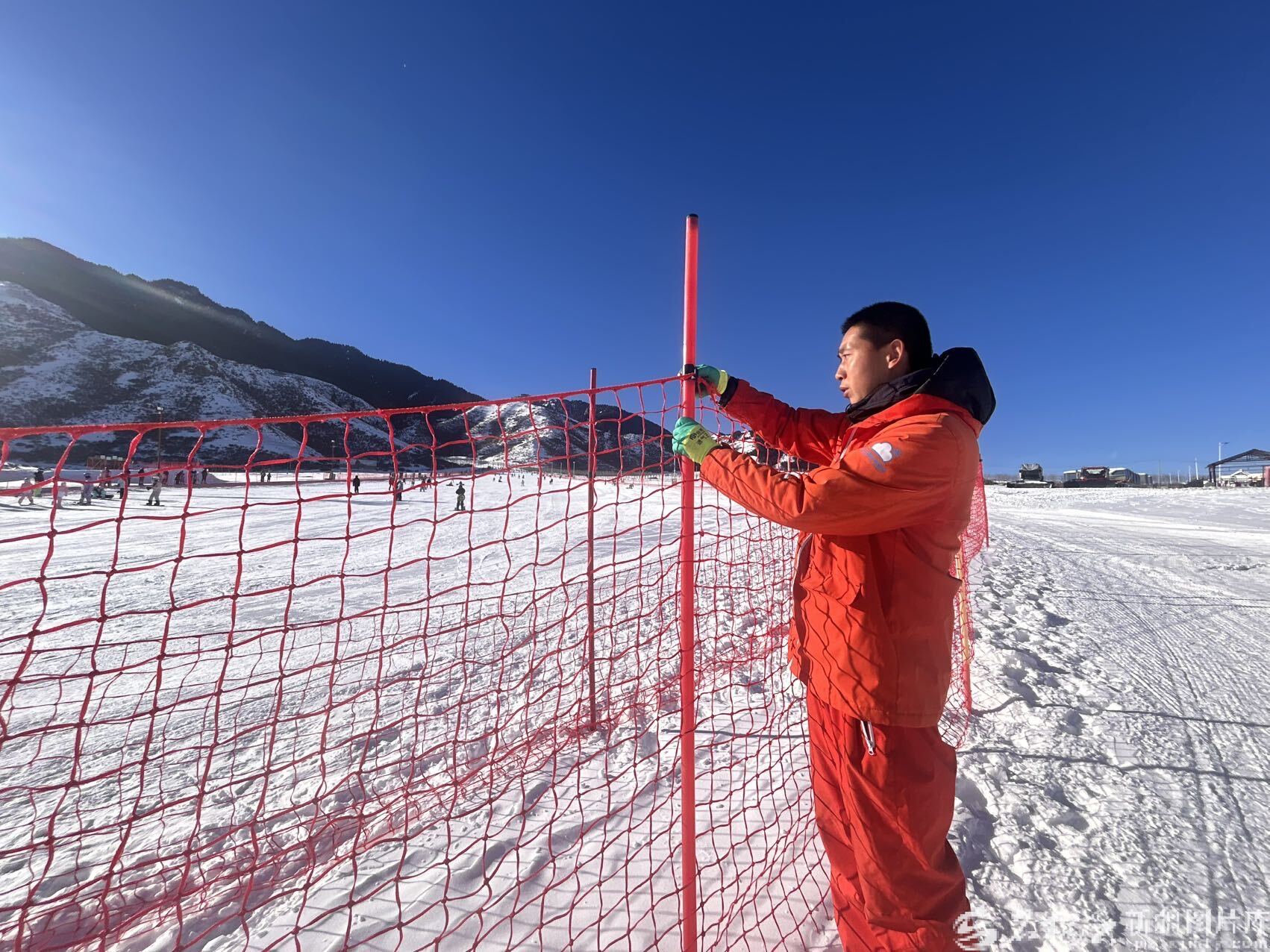 李彦周在检查雪道边的安全网。石榴云/新疆日报记者 张小宓摄