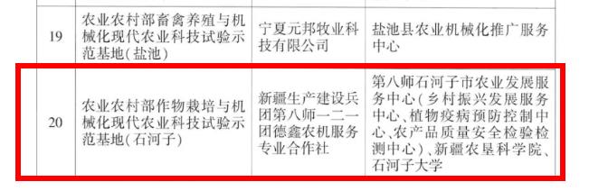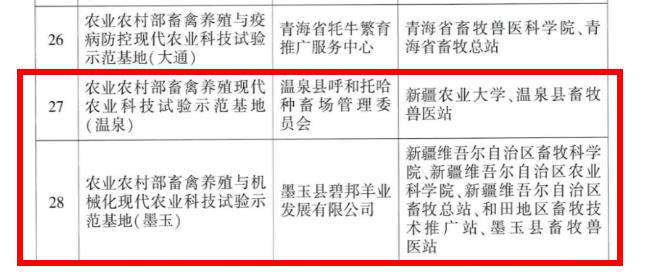 文件显示,新疆此次入选的基地包括,种植业类3个:农业农村部作物栽培与植物保护现代农业科技试验示范基地(库尔勒)、农业农村部作物栽培现代农业科技试验示范基地(库尔勒)、农业农村部作物栽培与育种现代农业科技试验示范基地(阿拉尔);畜牧兽医类3个:农业农村部畜禽养殖现代农业科技试验示范基地(温泉)、农业农村部畜禽养殖与机械化现代农业科技试验示范基地(墨玉)、农业农村部畜禽养殖与疫病防控现代农业科技试验示范基地(呼图壁);农机类1个,农业农村部作物栽培与机械化现代农业科技试验示范基地(石河子);资源环境类1个,农业农村部作物栽培与资源环境现代农业科技试验示范基地(新疆昌吉国家农业高新技术产业示范园)。
