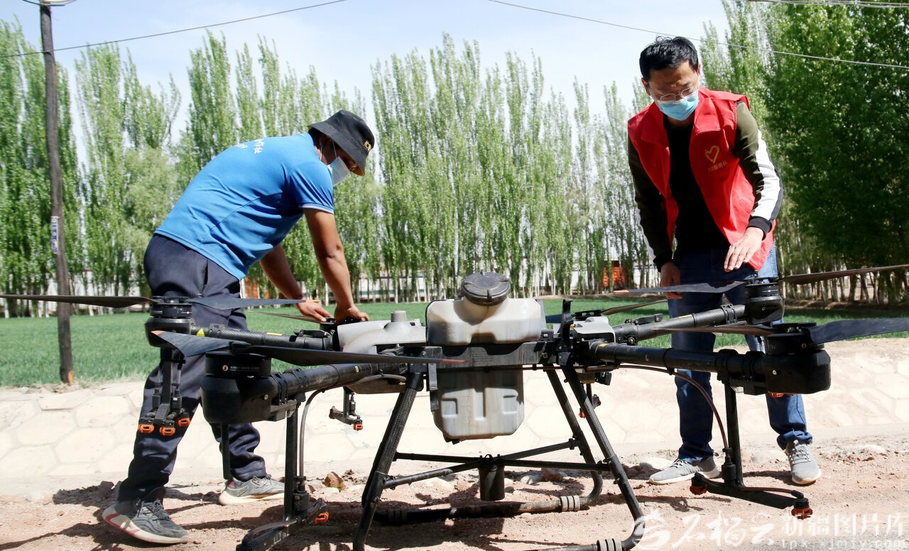 工作人员准备操作无人机在温宿县依希来木其乡斯也克村为小麦施肥(资料图片)。颜寿林摄