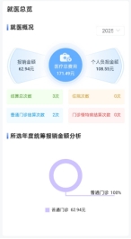 就医数据“深度读”,健康管理更主动:总览年度医疗总费用、医保报销金额及自付金额,就医行为全面复盘,让参保人清晰感受医保“托底”力度;概览住院、普通门诊、门诊慢病结算次数,通过就医费用走势,清晰展示医保结算历史;记录常去的医疗机构、就医地点(本地或异地)、就医备案情况,优化个人未来就医选择,真正实现“用数据帮着管健康”。