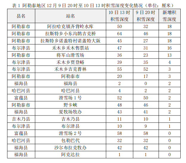 新增积雪深度前3位的站点为:阿勒泰市阿拉哈克镇齐背岭水库50厘米(新增18厘米)、阿勒泰市拉斯特乡小东沟鹊吉克桥64厘米(新增18厘米)、阿勒泰市拉斯特乡诺盖特村诺盖特大阪45厘米(新增18厘米)。