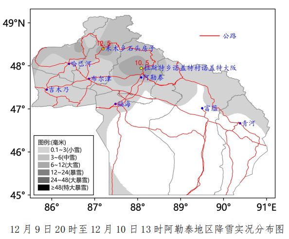 阿勒泰地区气象台发布降雪天气实况:12月9日20时至10日13时,全区普遍出现降雪天气,沿山及山区出现中到大雪,布尔津县石头房子出现暴雪(12.5毫米)。