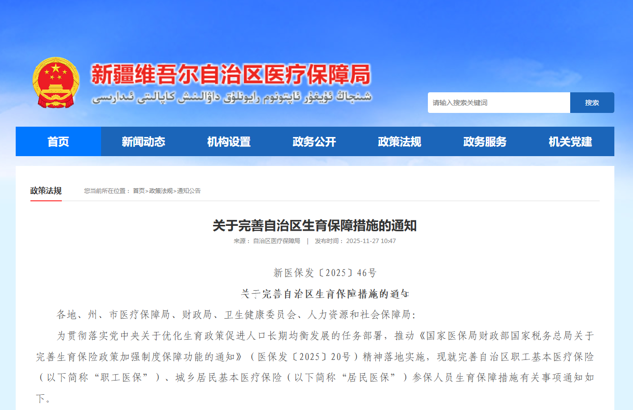 《通知》还提出,全面落实参保女职工享受国家法定产假和计划生育手术休假期间的生育津贴待遇。参保女职工符合《新疆维吾尔自治区人口与计划生育条例》规定生育的,按自治区生育津贴享受天数执行。