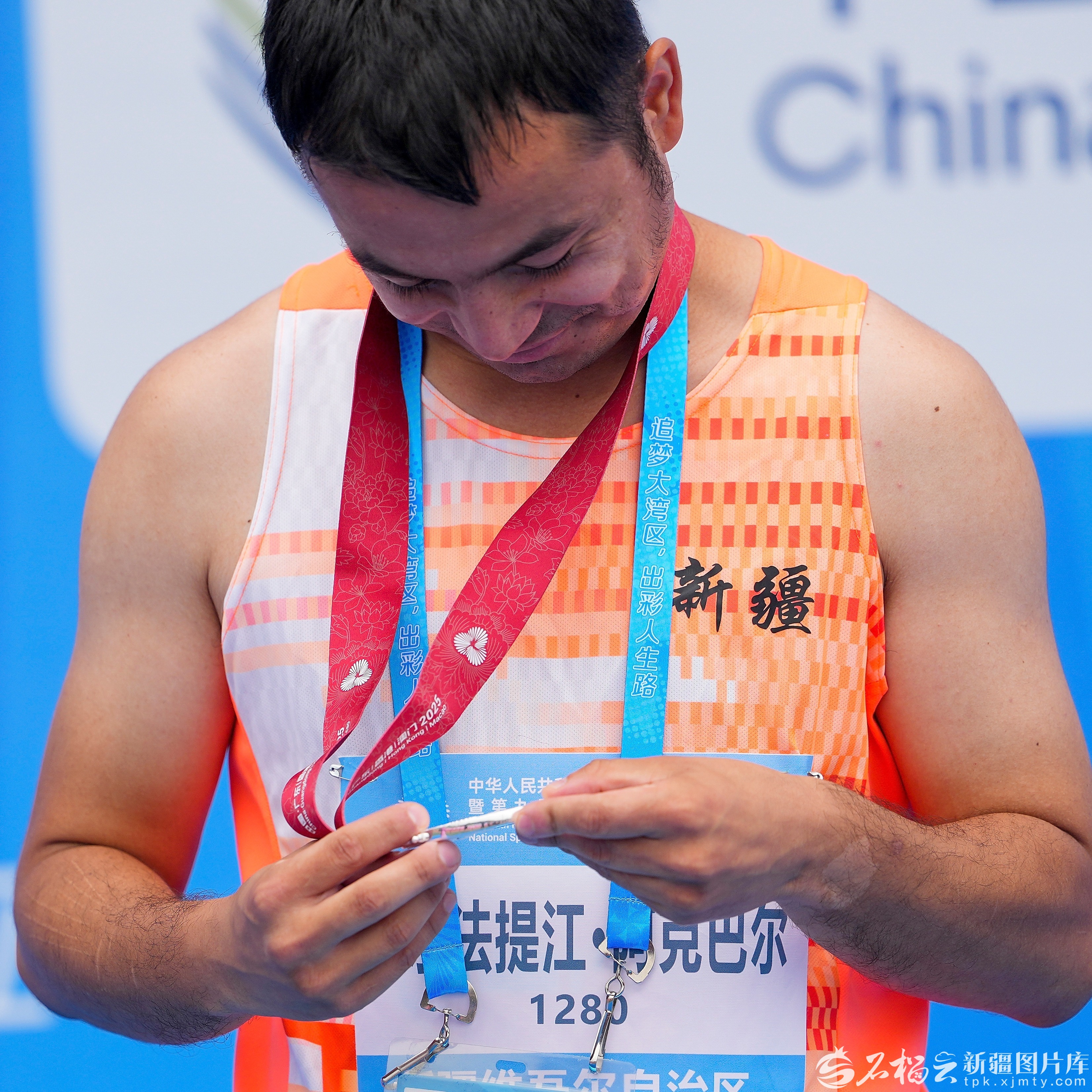 12月10日,在男子30岁以上组400米决赛颁奖仪式上,获得亚军的新疆队选手阿尔法提江·阿克巴尔查看奖牌。残特奥会官方信息服务平台供图