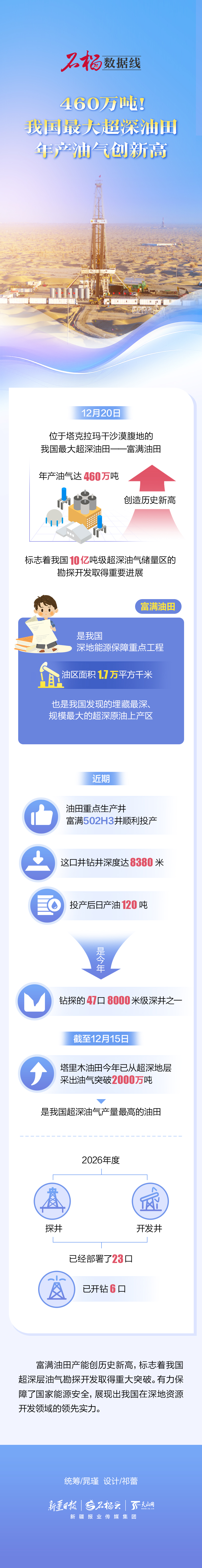 12月20日,位于塔克拉玛干沙漠腹地的我国最大超深油田——富满油田年产油气达460万吨,创造历史新高,标志着我国10亿吨级超深油气储量区的勘探开发取得重要进展。有力保障了国家能源安全,展现出我国在深地资源开发领域的领先实力。