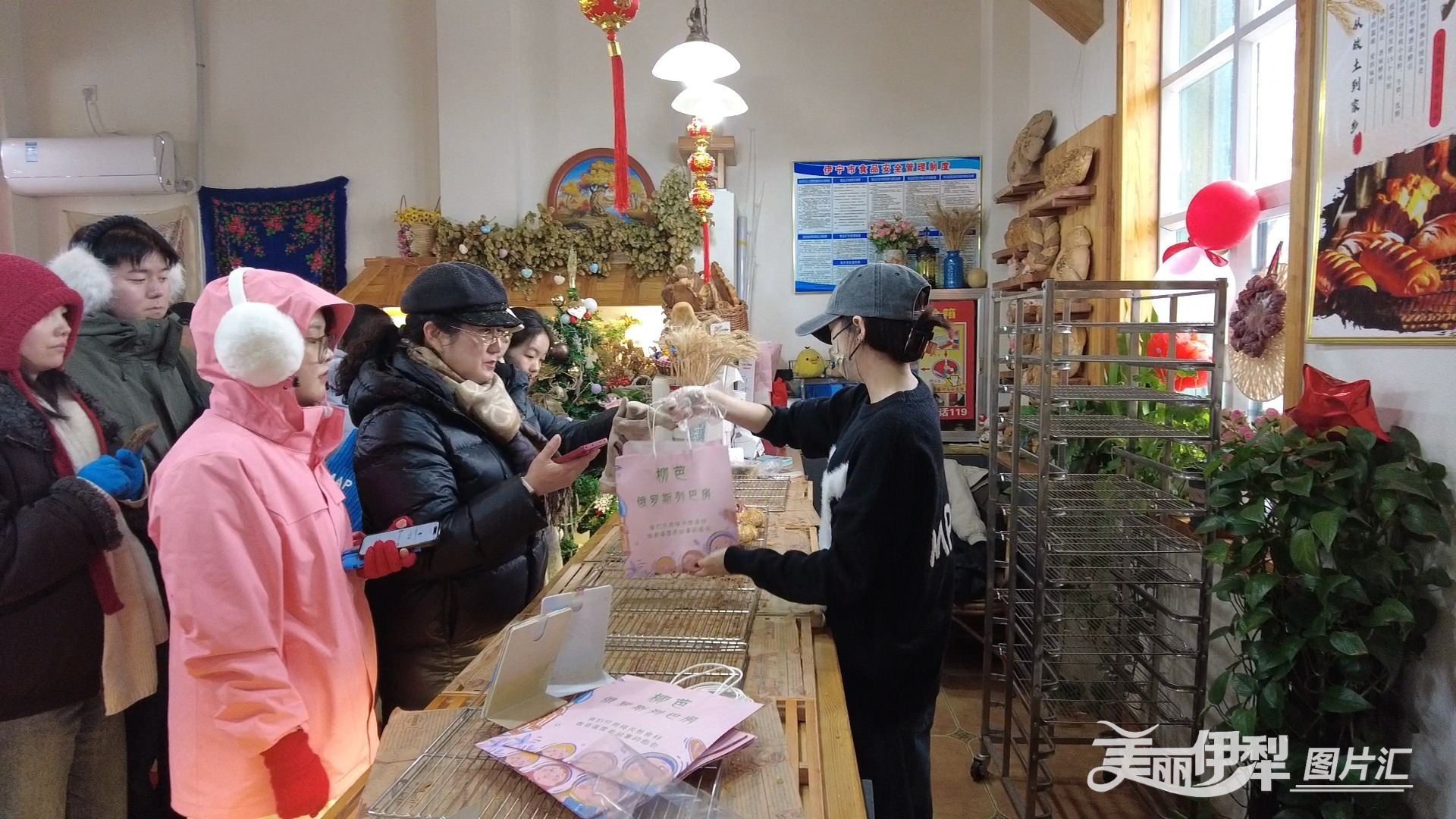 伊宁市六星街的列巴店里,游客们在排队购买列巴、面包。杨静怡 摄