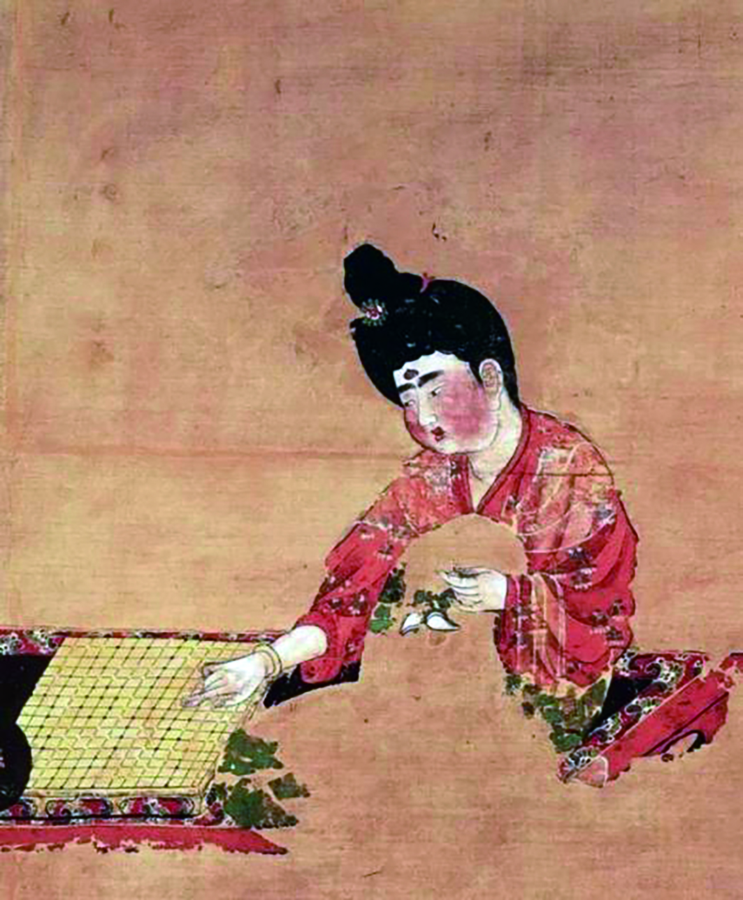 1972年,考古工作者在吐鲁番阿斯塔那187号墓中发现了一幅绢画《弈棋仕女图》,画中贵妇体态丰盈、面庞红润,身着红缎团花斜领长裙宽袖,腰束黄底绿花彩带,头梳天宝髻,扎一朵红色小花,端坐棋盘一边,右手食指和中指拈起棋子,神态投入,似为寻得落子之处费心思量。