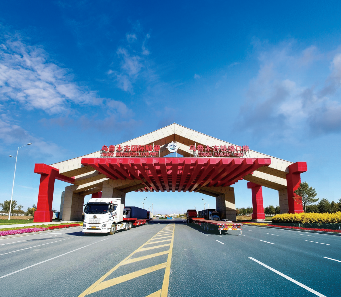 货运卡车驶出乌鲁木齐国际陆港区。蔡增乐/摄