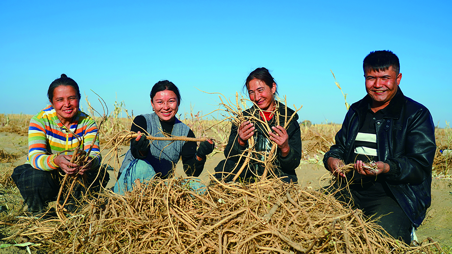 于田县兰干博孜亚农场塔克拉玛干沙漠防沙治沙基地里,1000亩黄芪迎来采收期。伊帕尔古丽·日介甫/摄