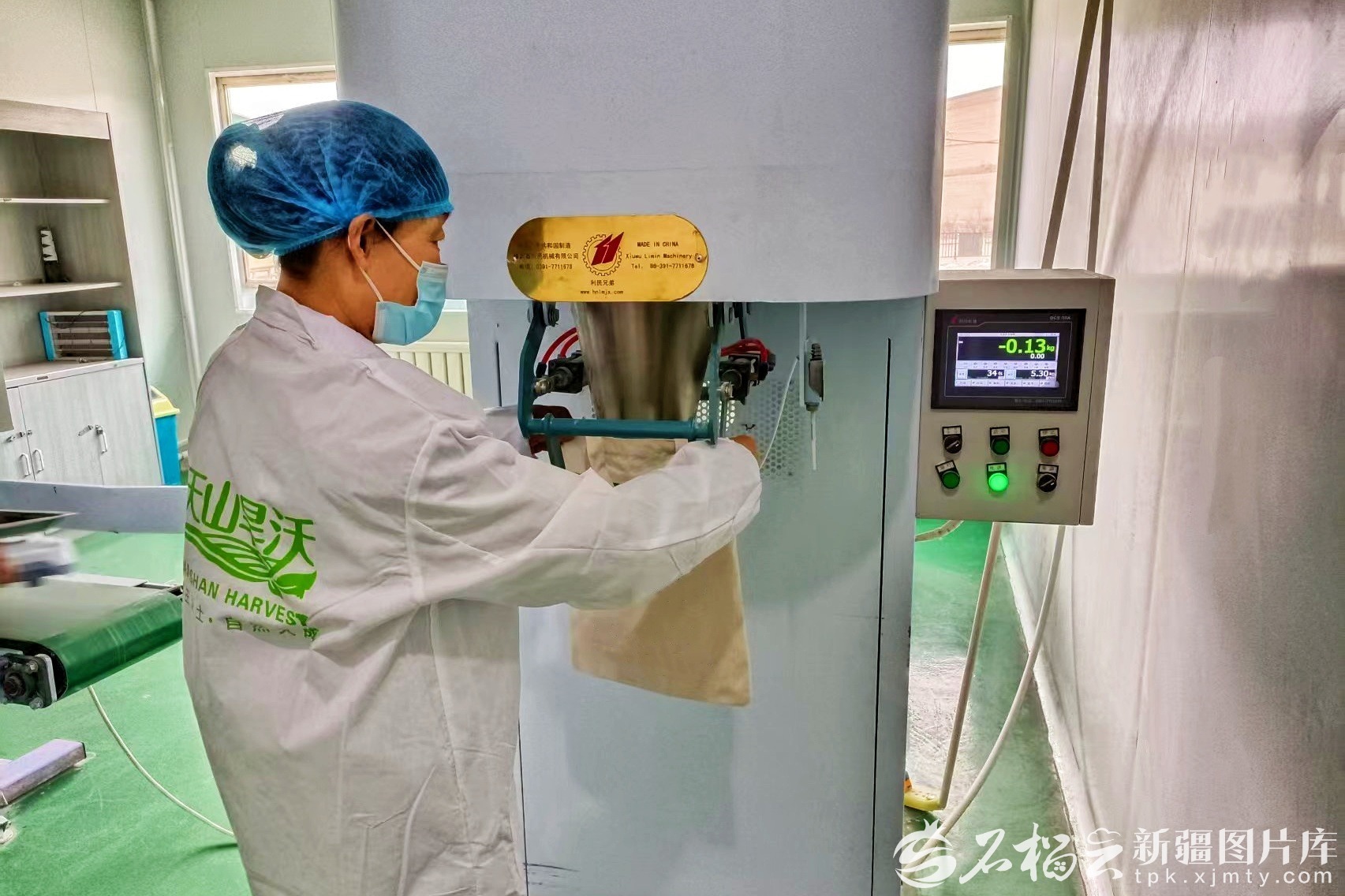 木垒哈萨克自治县鹰嘴豆入选“品味新疆”好产品品牌目录。图为11月26日,木垒一家鹰嘴豆加工企业生产车间,工人在包装鹰嘴豆粉。图/木垒哈萨克自治县融媒体中心提供