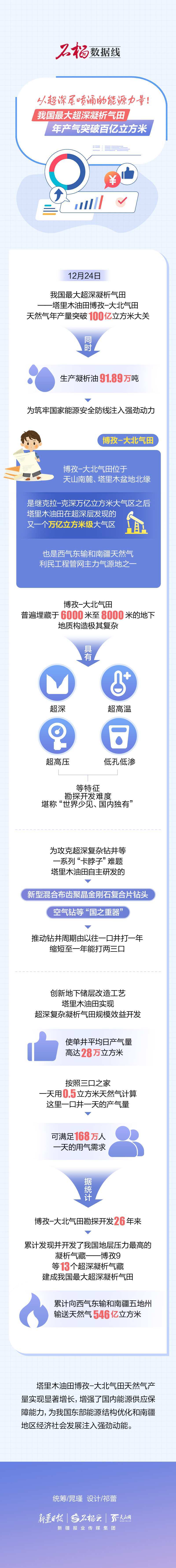 12月24日,我国最大超深凝析气田——塔里木油田博孜-大北气田天然气年产量突破100亿立方米大关,同时生产凝析油91.89万吨。
