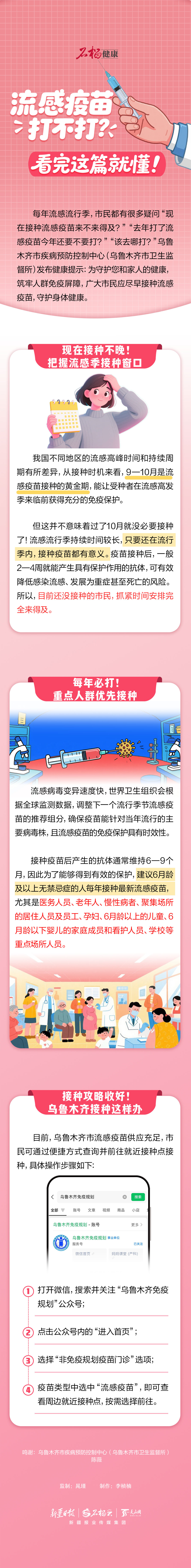 每年流感流行季,市民都有很多疑问“现在接种流感疫苗来不来得及?”“去年打了流感疫苗今年还要不要打?”“该去哪打?”乌鲁木齐市疾病预防控制中心(乌鲁木齐市卫生监督所)发布健康提示:为守护您和家人的健康,筑牢人群免疫屏障,广大市民应尽早接种流感疫苗,守护身体健康。