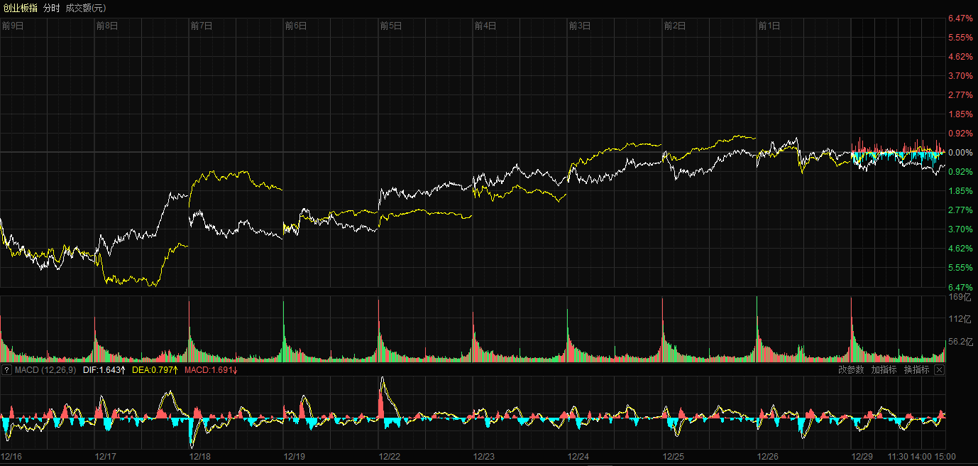 天山网-新疆日报讯(记者康颢严报道)12月29日,A股三大指数涨跌不一,沪指日线九连阳。截至收盘,沪指涨0.04%,报收3965.28点;深证成指跌0.49%,报收13537.10点;创业板指跌0.66%,报收3222.61点。沪深两市成交额21393亿元,较上一交易日小幅缩量209亿元。