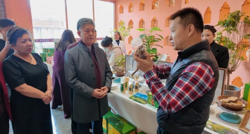 在玛纳斯县“玛河寻味·阿魏飘香”阿魏体验店,玛纳斯美农阿魏生态科技有限公司负责人谢忠武(右一)介绍阿魏产品。朱文斌 摄