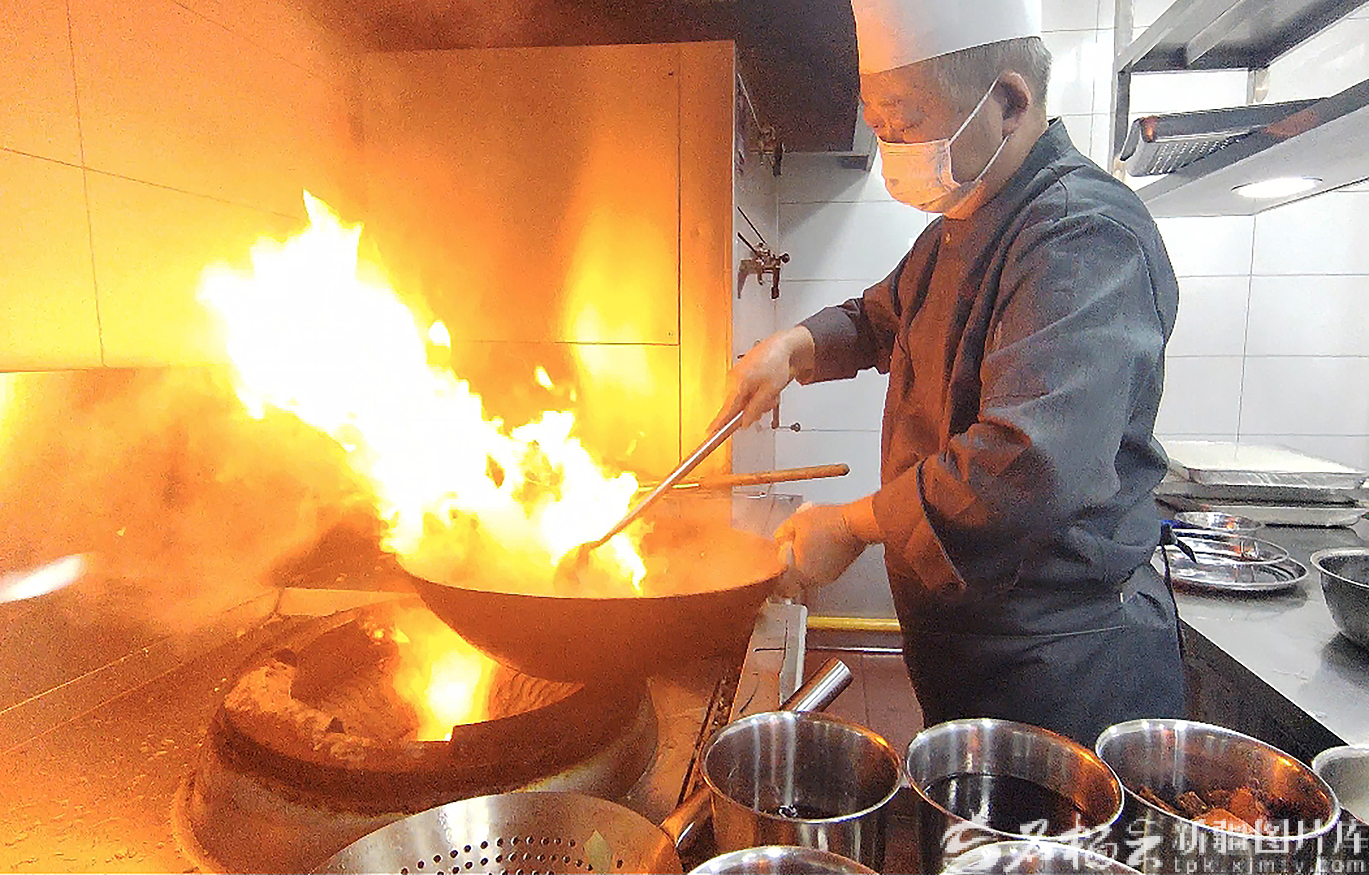 工作人员在后堂炒菜。