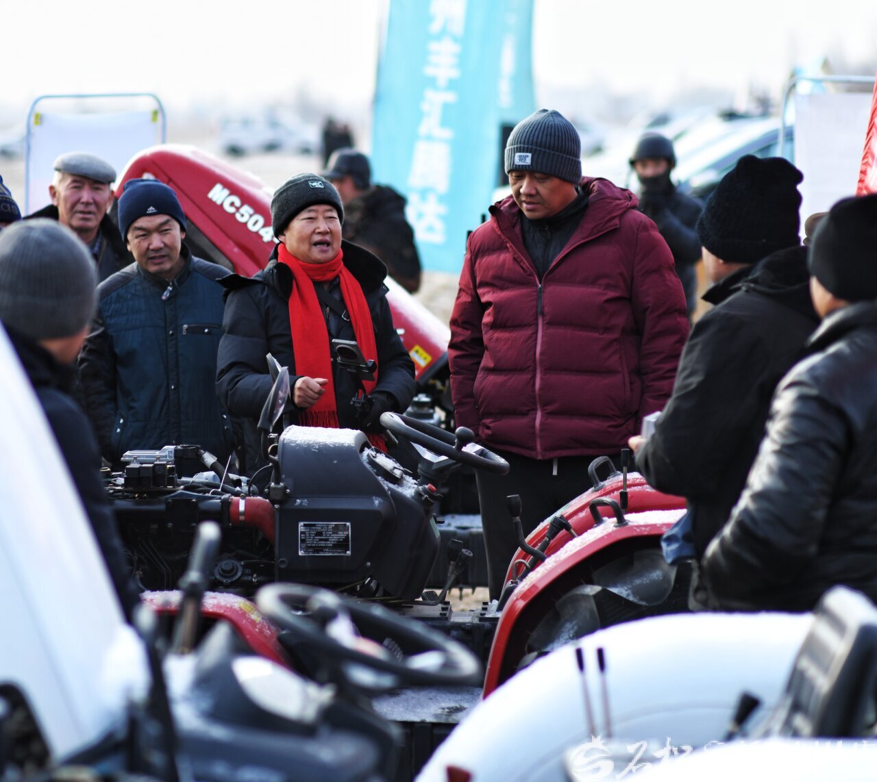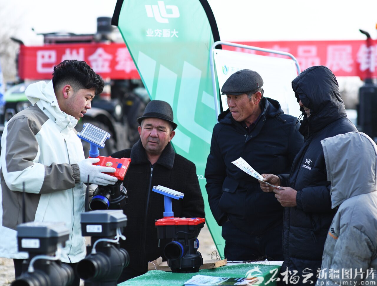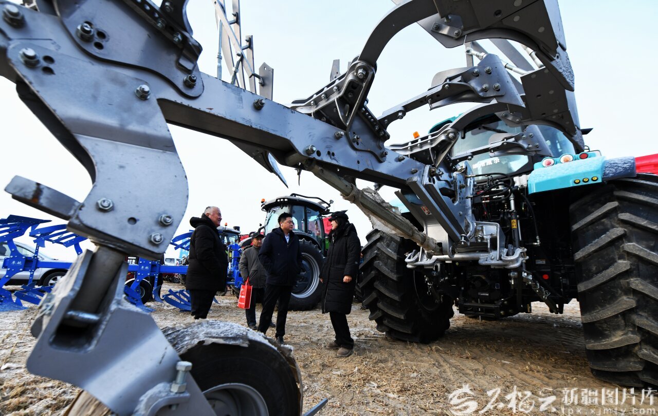 1月3日,库尔勒市哈拉玉宫镇“惠农新未来”农业机械展销会上,农户在了解选购农机。