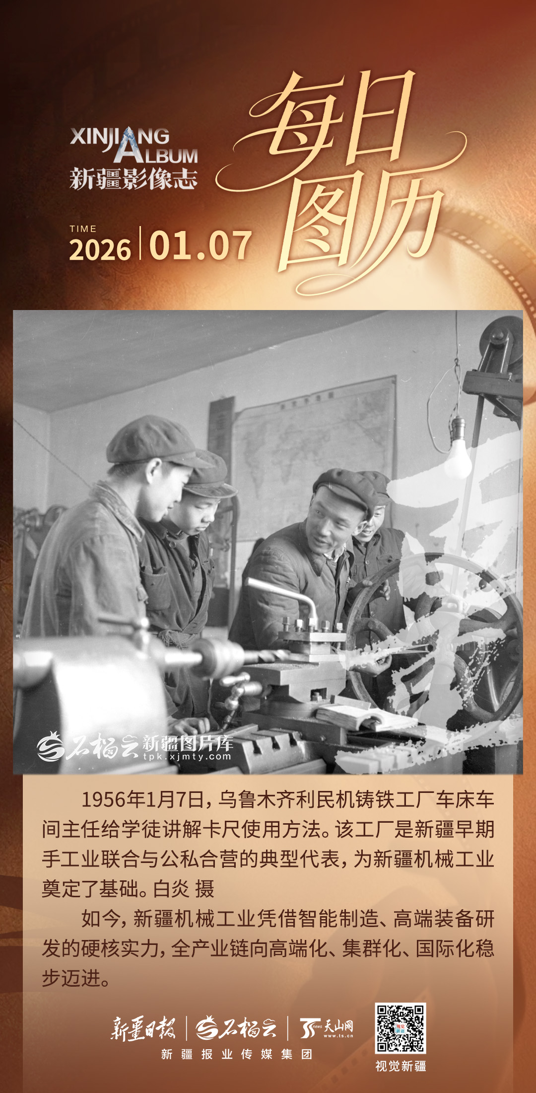 1956年1月7日,乌鲁木齐利民机铸铁工厂车床车间主任给学徒讲解卡尺使用方法。该工厂是新疆早期手工业联合与公私合营的典型代表,为新疆机械工业奠定了基础。白炎 摄