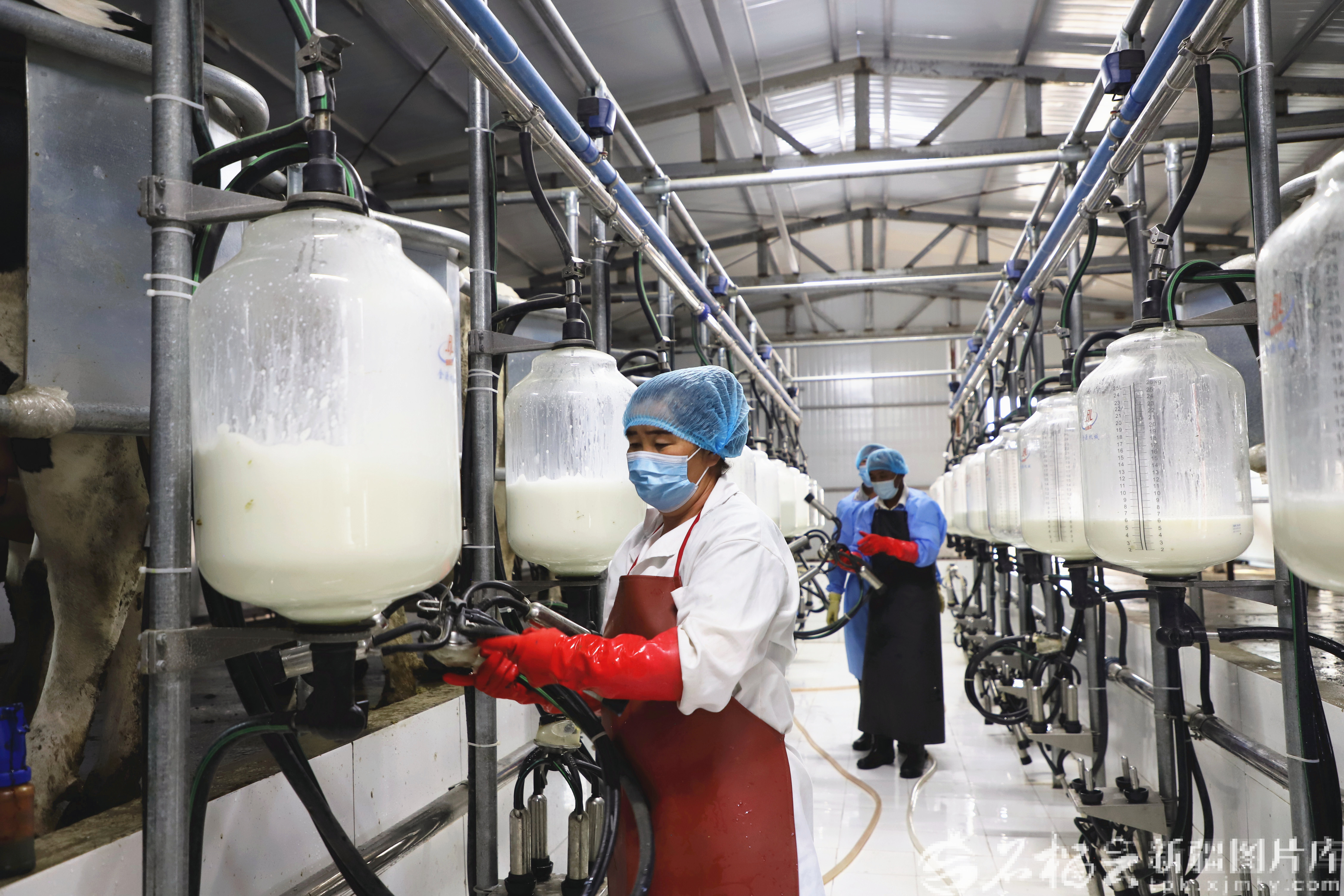 1月5日,在阿合奇县苏木塔什乡克孜勒宫拜孜村奶牛养殖基地,工人们在挤奶车间操作设备。古丽加马力·艾萨摄