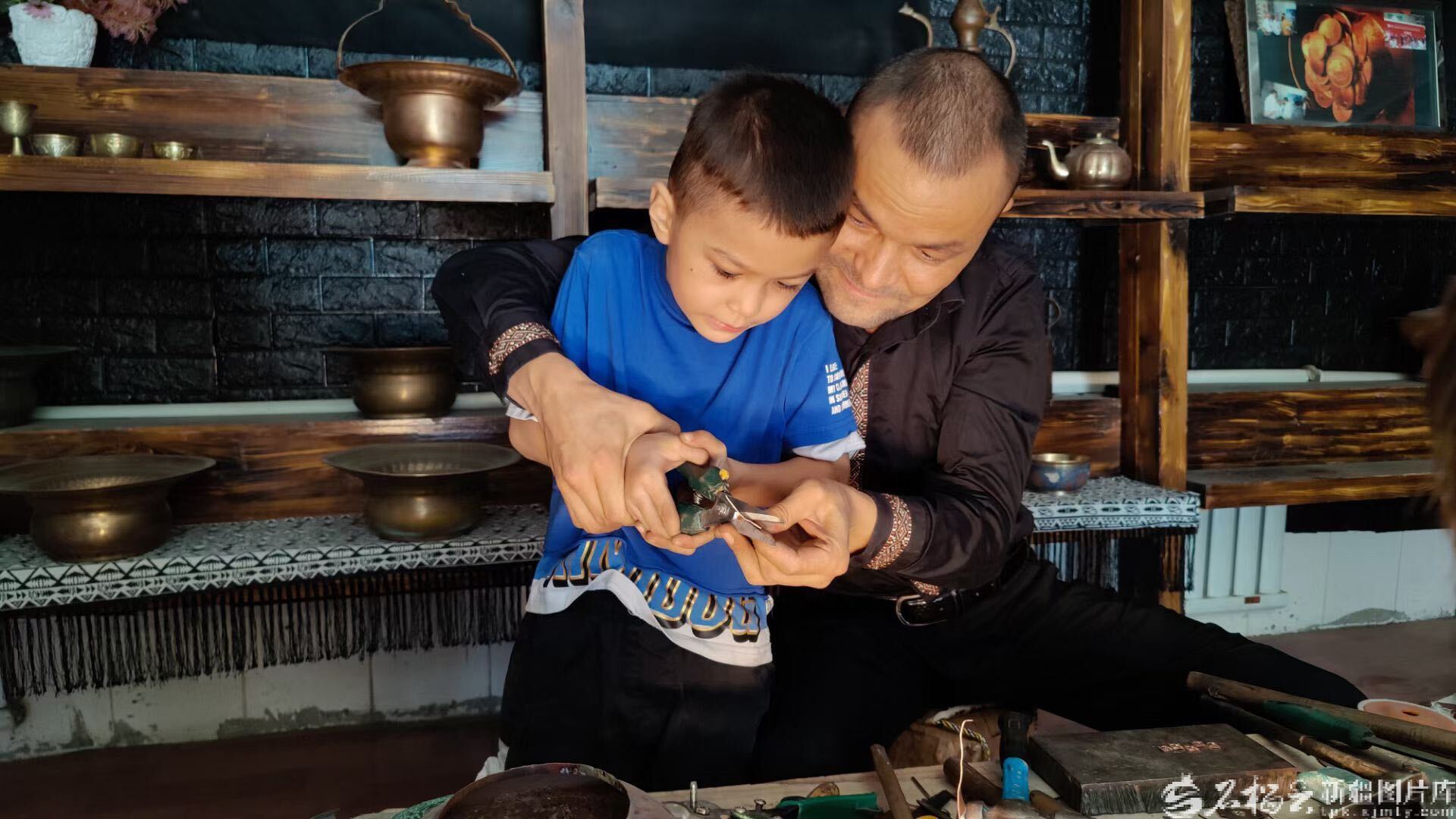 玉素甫·卡地教授儿子学习制作铜器。本人供图