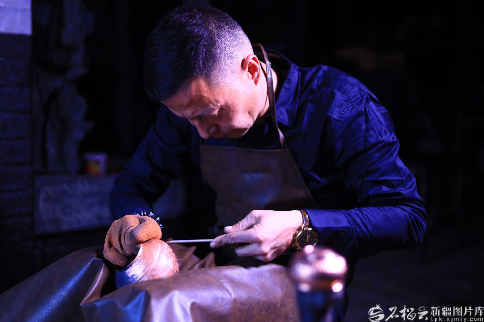 买买提·卡地制作铜器。玉素甫·卡地 摄