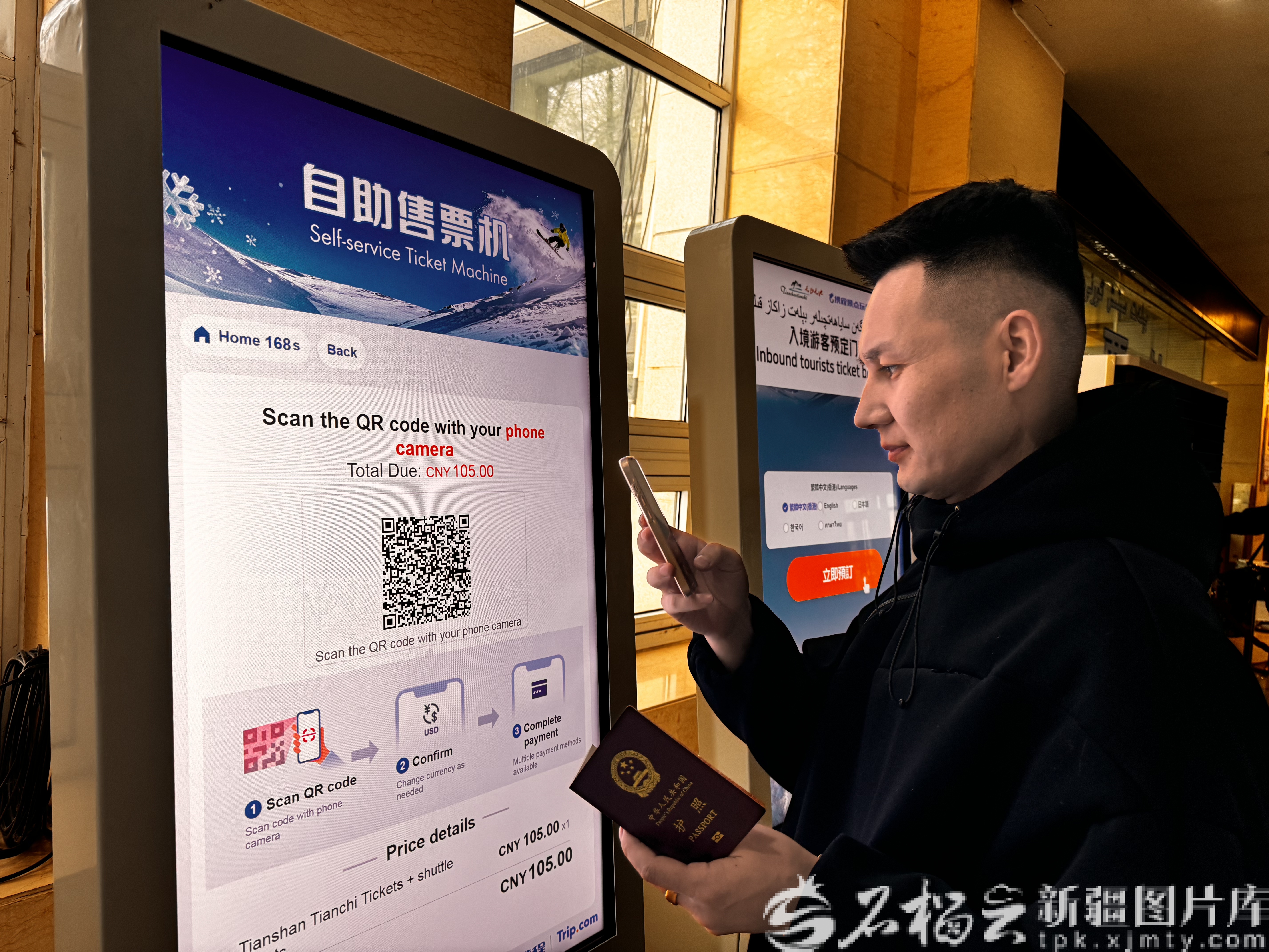 外籍游客使用国际版智慧化自助售(取)票机。新疆天池管理委员会供图