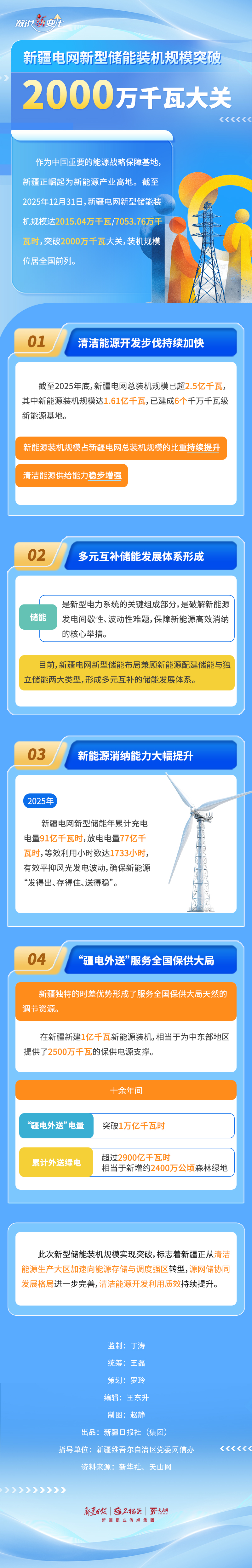 截至2025年12月31日,新疆电网新型储能装机规模达2015.04万千瓦/7053.76万千瓦时,突破2000万千瓦大关。当前新疆电网新型储能布局情况如何?新能源消纳能力怎样提升?本期《数说“新”变化》带您一同了解。