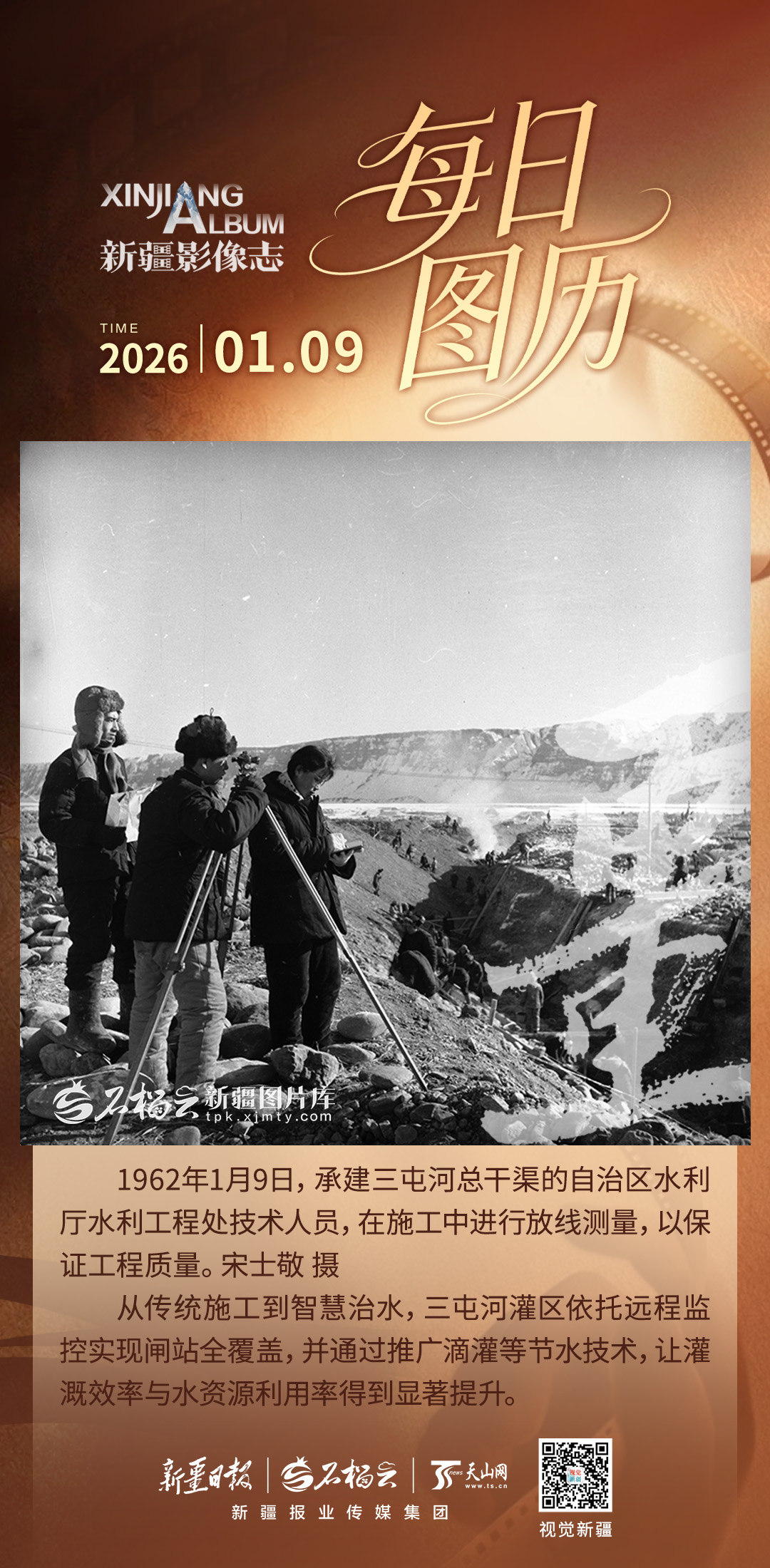 1962年1月9日,承建三屯河总干渠的自治区水利厅水利工程处技术人员,在施工中进行放线测量,以保证工程质量。宋士敬 摄
