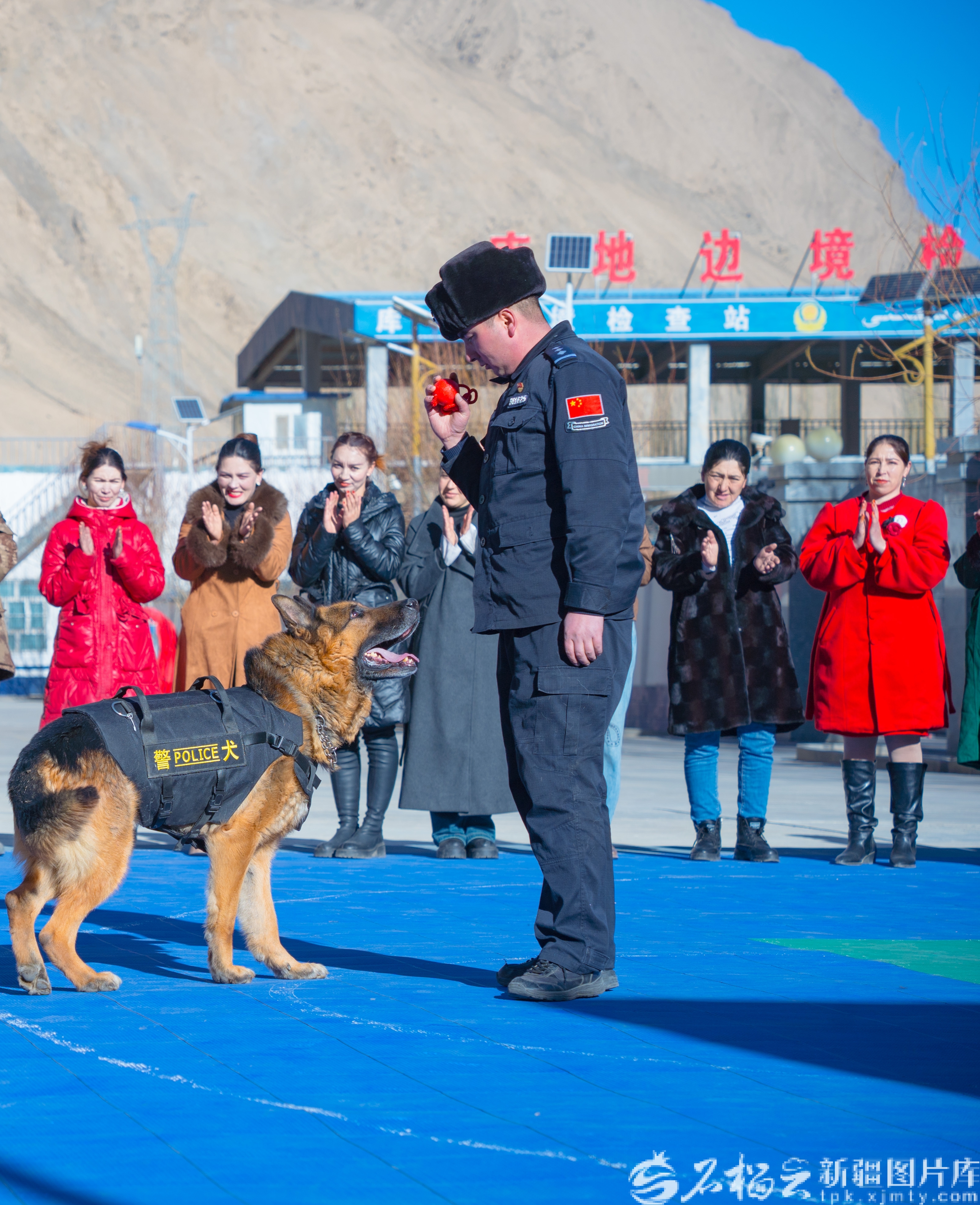 1月8日,新疆出入境边防检查总站喀什边境管理支队库地边境检查站民警向驻地群众展演警犬技能,赢得群众掌声。何伟摄