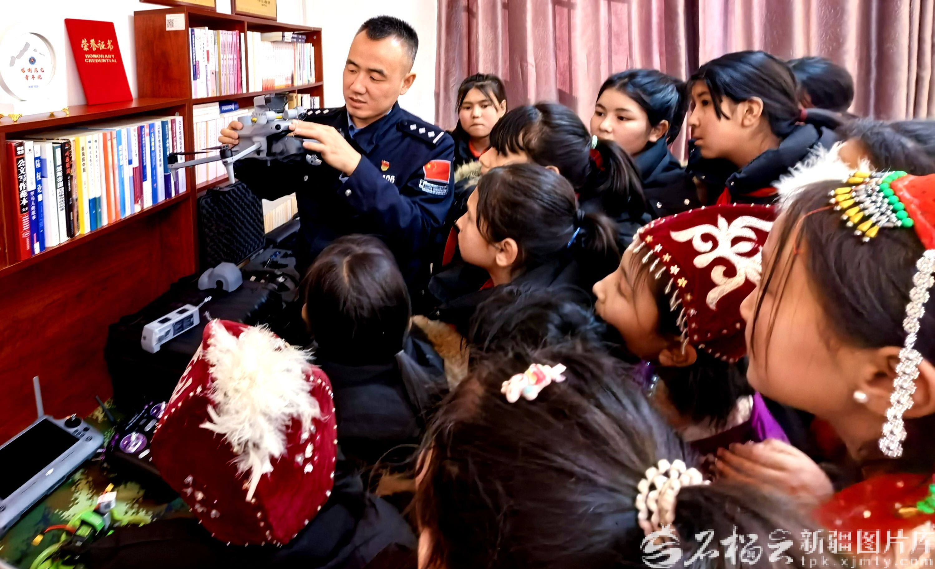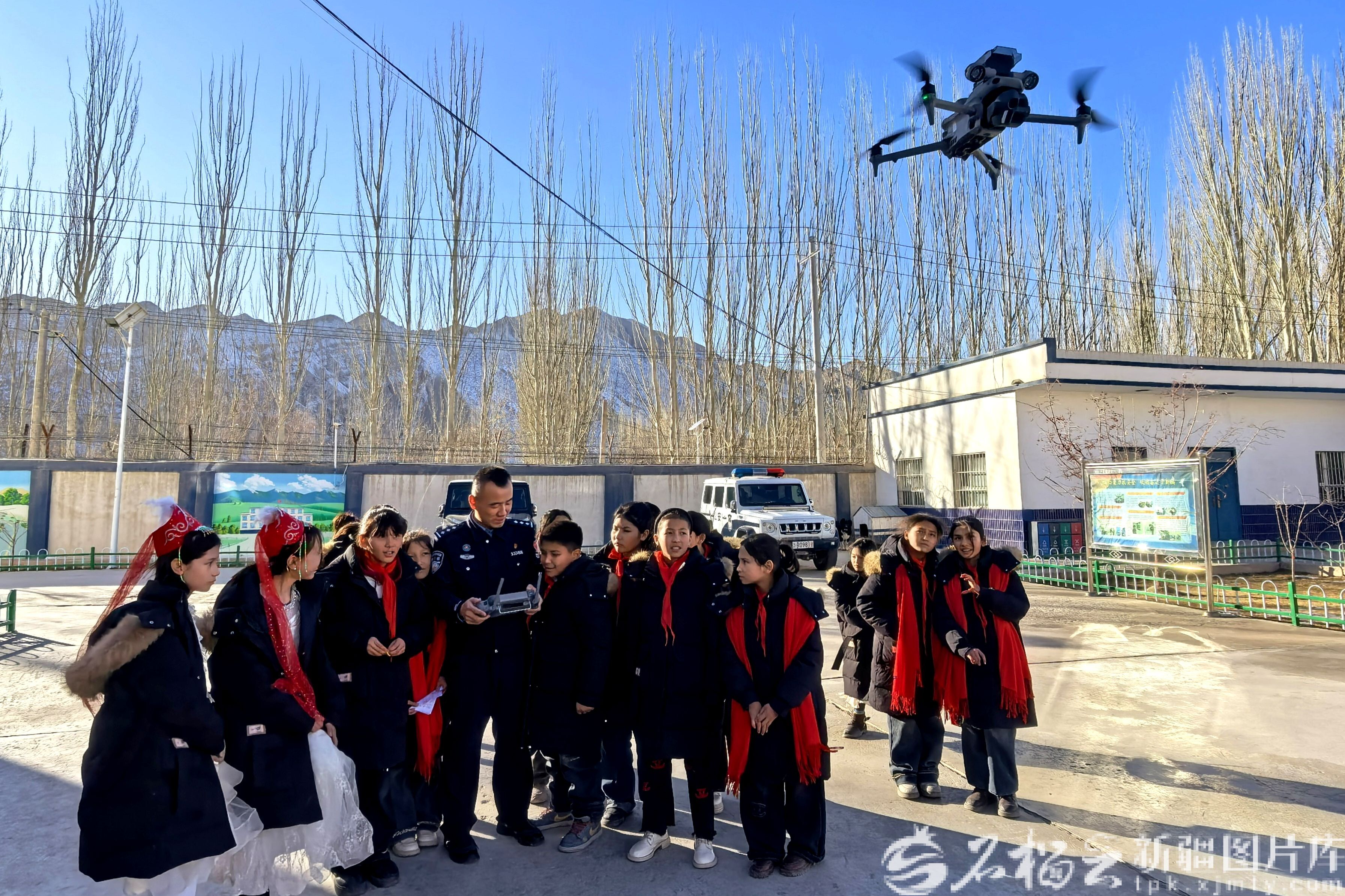 1月9日,新疆出入境边防检查总站和田边境管理支队康克尔边境派出所民警李聪给学生讲解警用无人机使用操作流程。李万葛摄