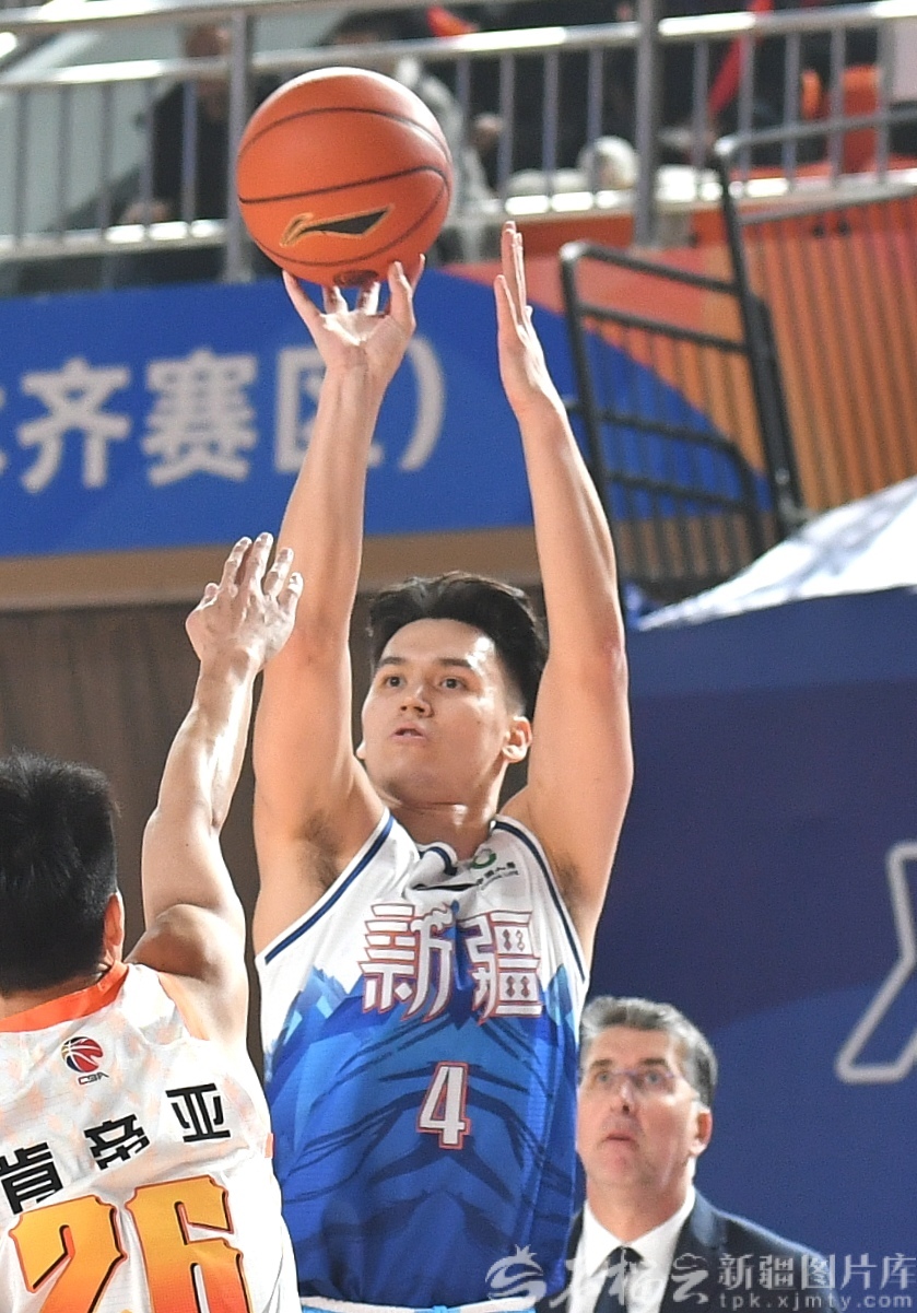 1月11日,新疆男篮球员伊力福拉提(右)远投三分球。天山网-新疆日报记者 邹懿 摄