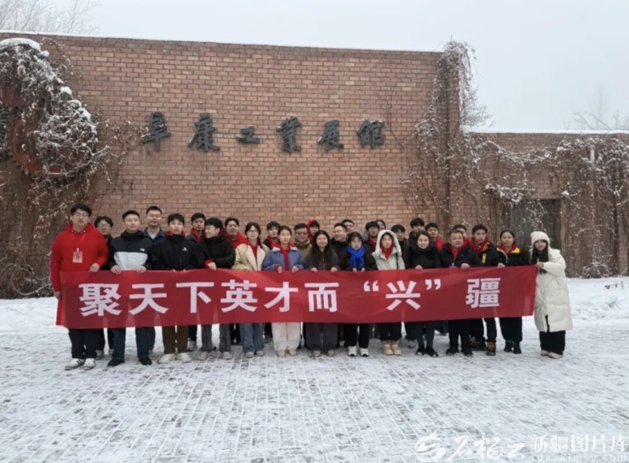 高校优秀学生代表与阜康市工作人员在阜康工业展馆合影留念。王仁静 摄
