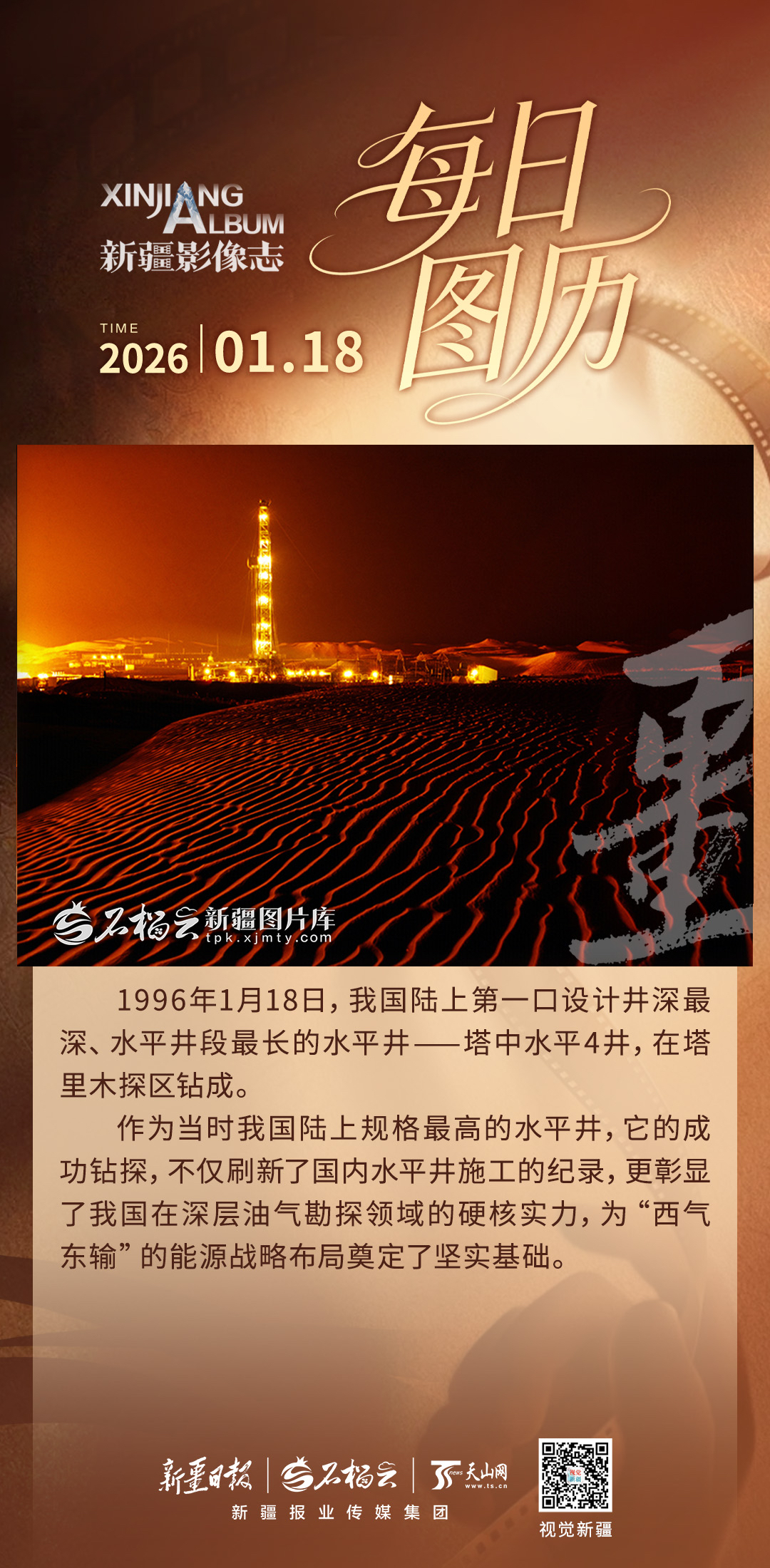 1996年1月18日,我国陆上第一口设计井深最深、水平井段最长的水平井—塔中水平4井,在塔里木探区钻成。