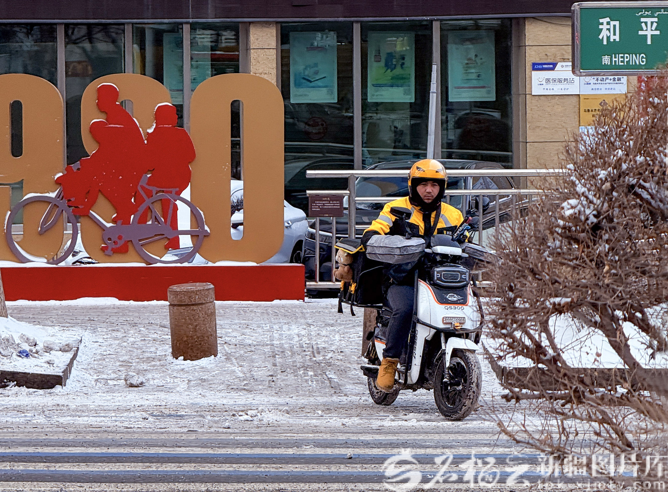 街头巷尾,外卖骑手裹着防风护膝,骑着电动车缓慢前行,将热餐送往千家万户,用奔波守护城市便利。