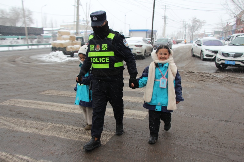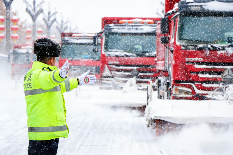 极端天气给群众出行和生产生活带来严峻挑战,奎屯市公安局交警指挥清雪车辆通行。奎屯市融媒体中心供图