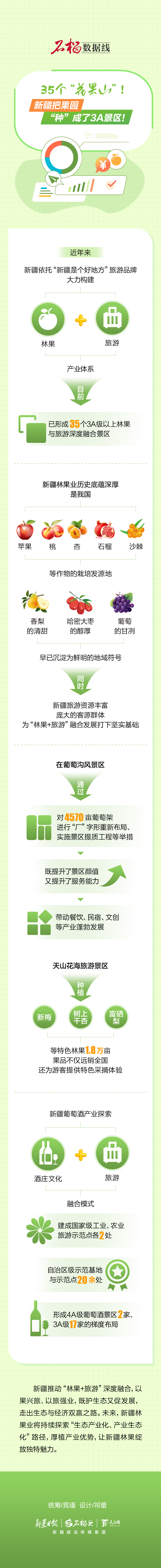 近年来,新疆依托“新疆是个好地方”旅游品牌,大力构建“林果+旅游”产业体系,目前已形成35个3A级以上林果与旅游深度融合景区。