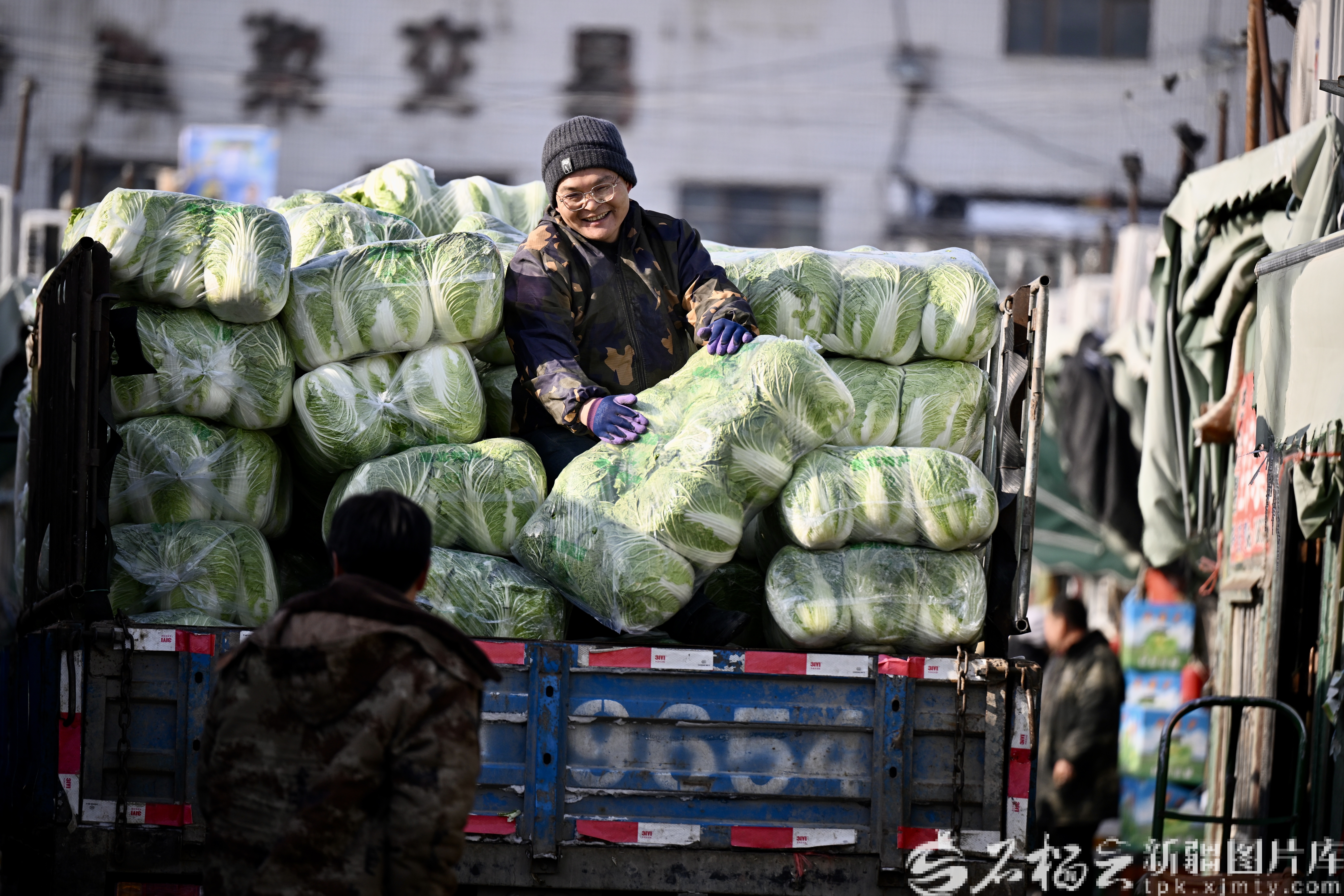 1月21日,商户在凌庆蔬菜果品批发市场卸货。