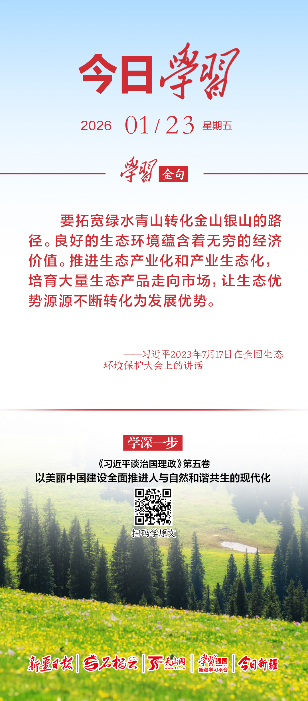 要拓宽绿水青山转化金山银山的路径。良好的生态环境蕴含着无穷的经济价值。推进生态产业化和产业生态化,培育大量生态产品走向市场,让生态优势源源不断转化为发展优势。
