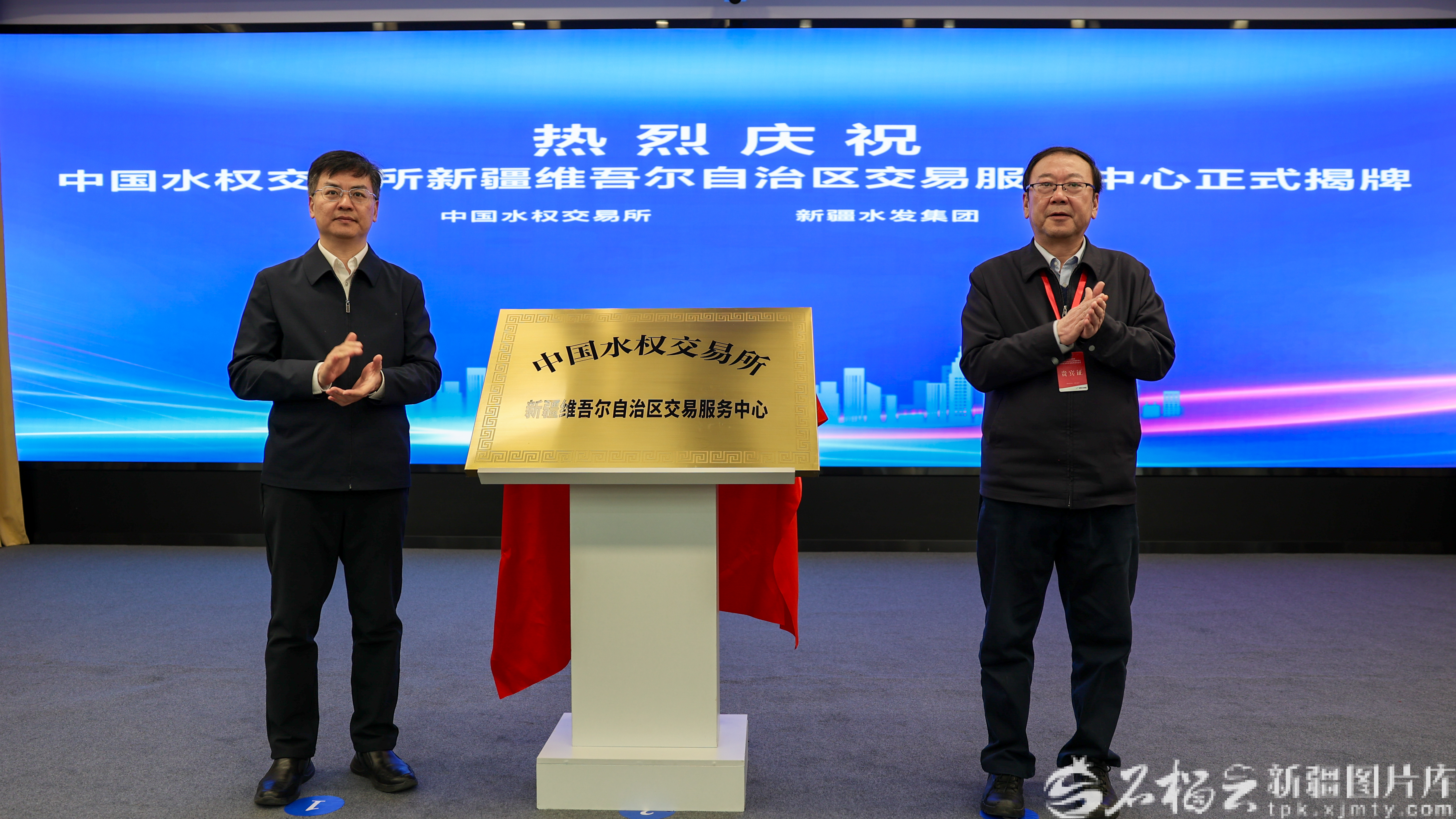 1月23日,中国水权交易所股份有限公司总经理李云成(左),新疆水利发展投资(集团)有限公司党委书记、董事长袁同军(右)共同为“中国水权交易所新疆维吾尔自治区交易服务中心”揭牌。新疆水利发展投资(集团)有限公司供图
