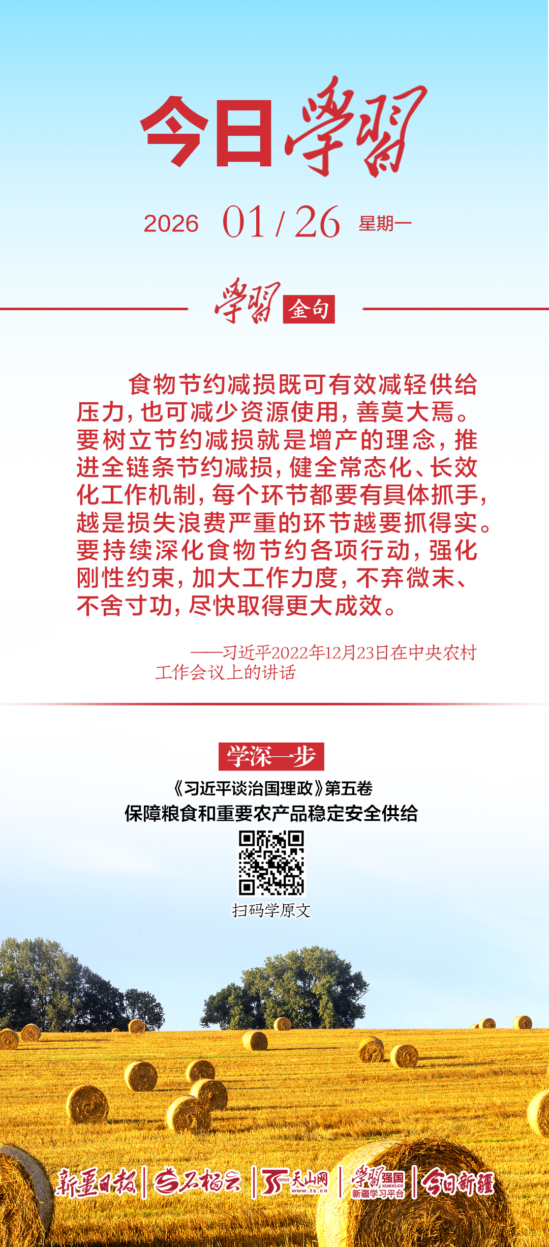 食物节约减损既可有效减轻供给压力,也可减少资源使用,善莫大焉。要树立节约减损就是增产的理念,推进全链条节约减损,健全常态化、长效化工作机制,每个环节都要有具体抓手,越是损失浪费严重的环节越要抓得实。要持续深化食物节约各项行动,强化刚性约束,加大工作力度,不弃微末、不舍寸功,尽快取得更大成效。