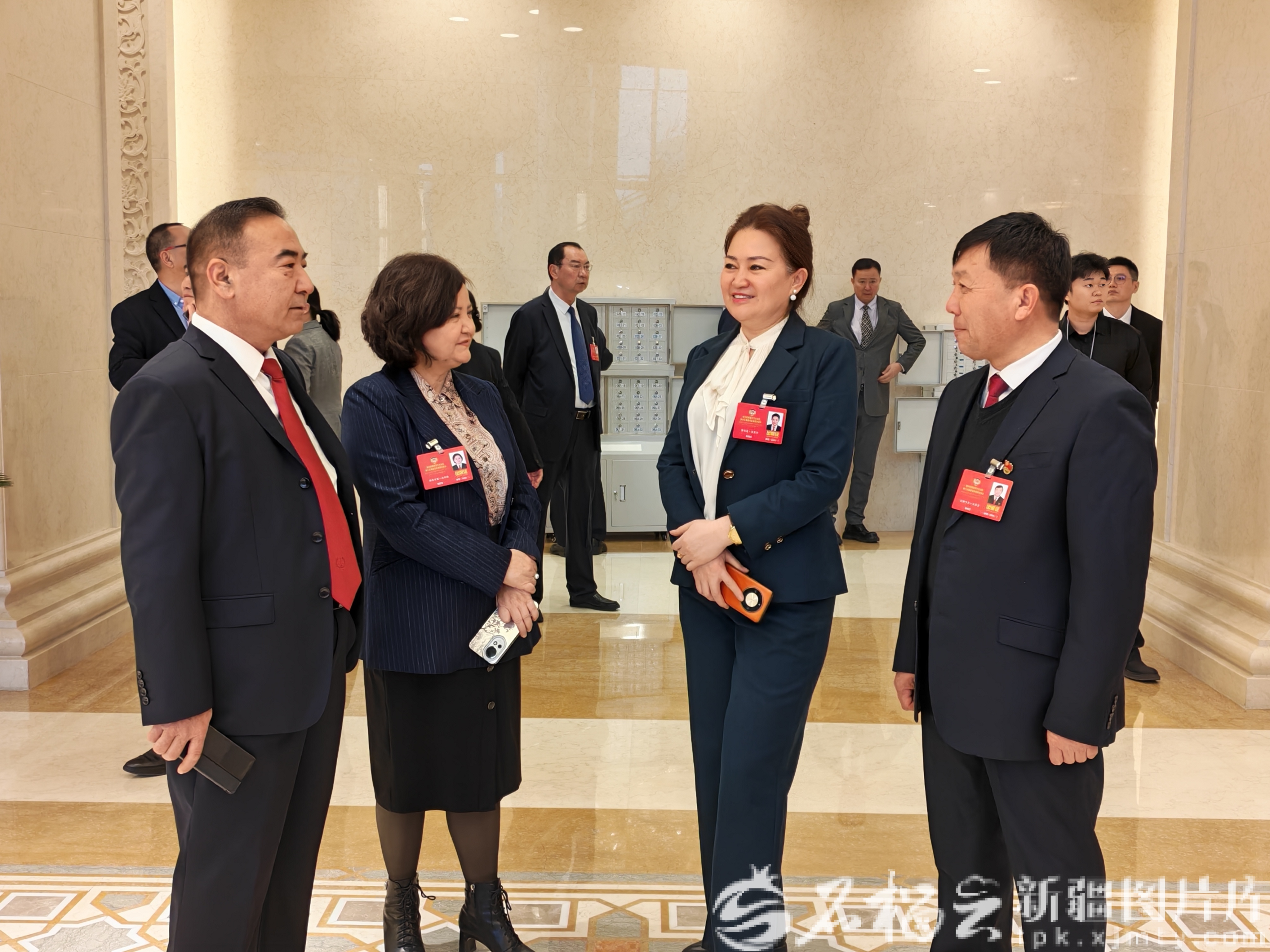 1月26日上午,出席自治区政协十三届四次会议的政协委员在新疆人民会堂大厅交流。
