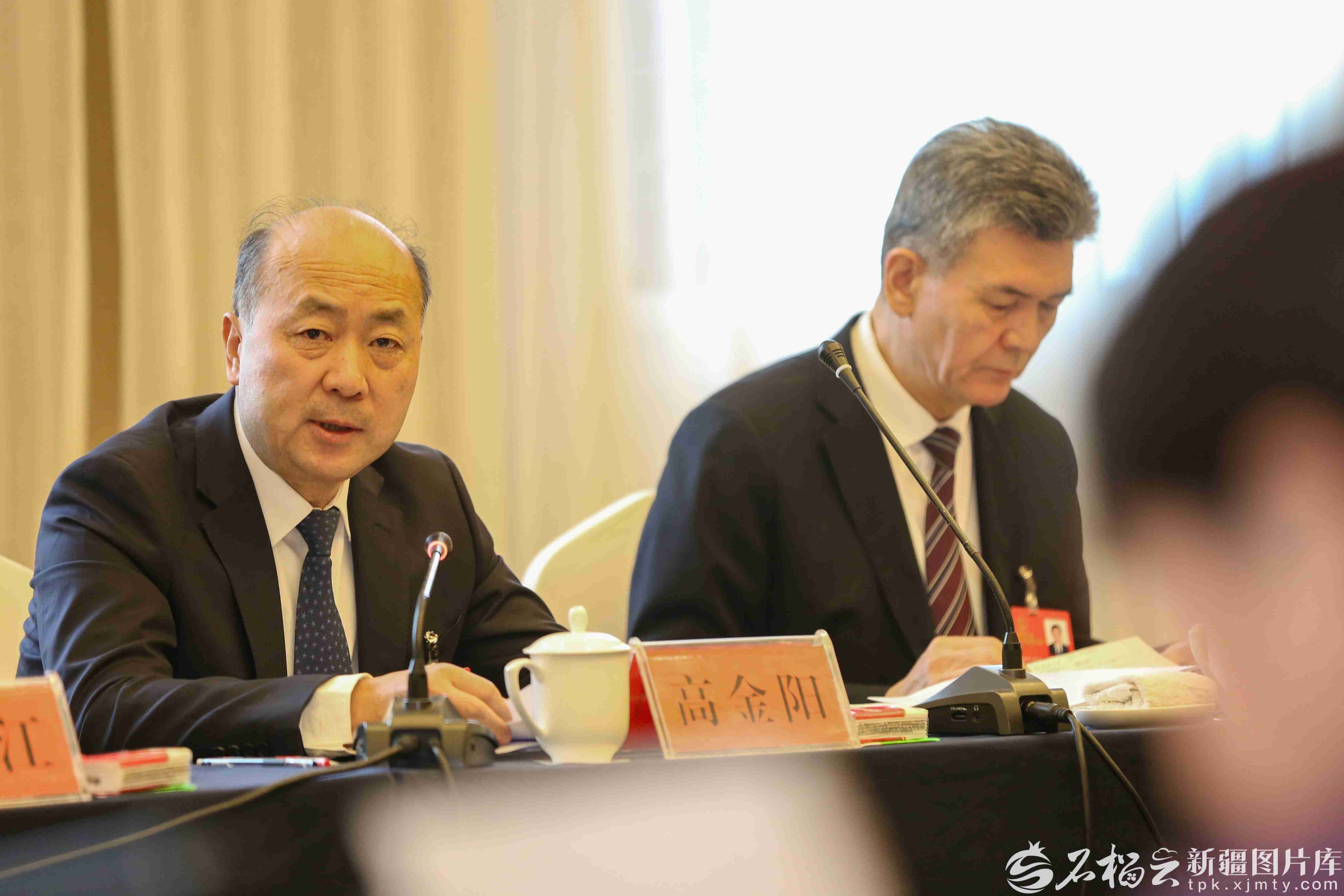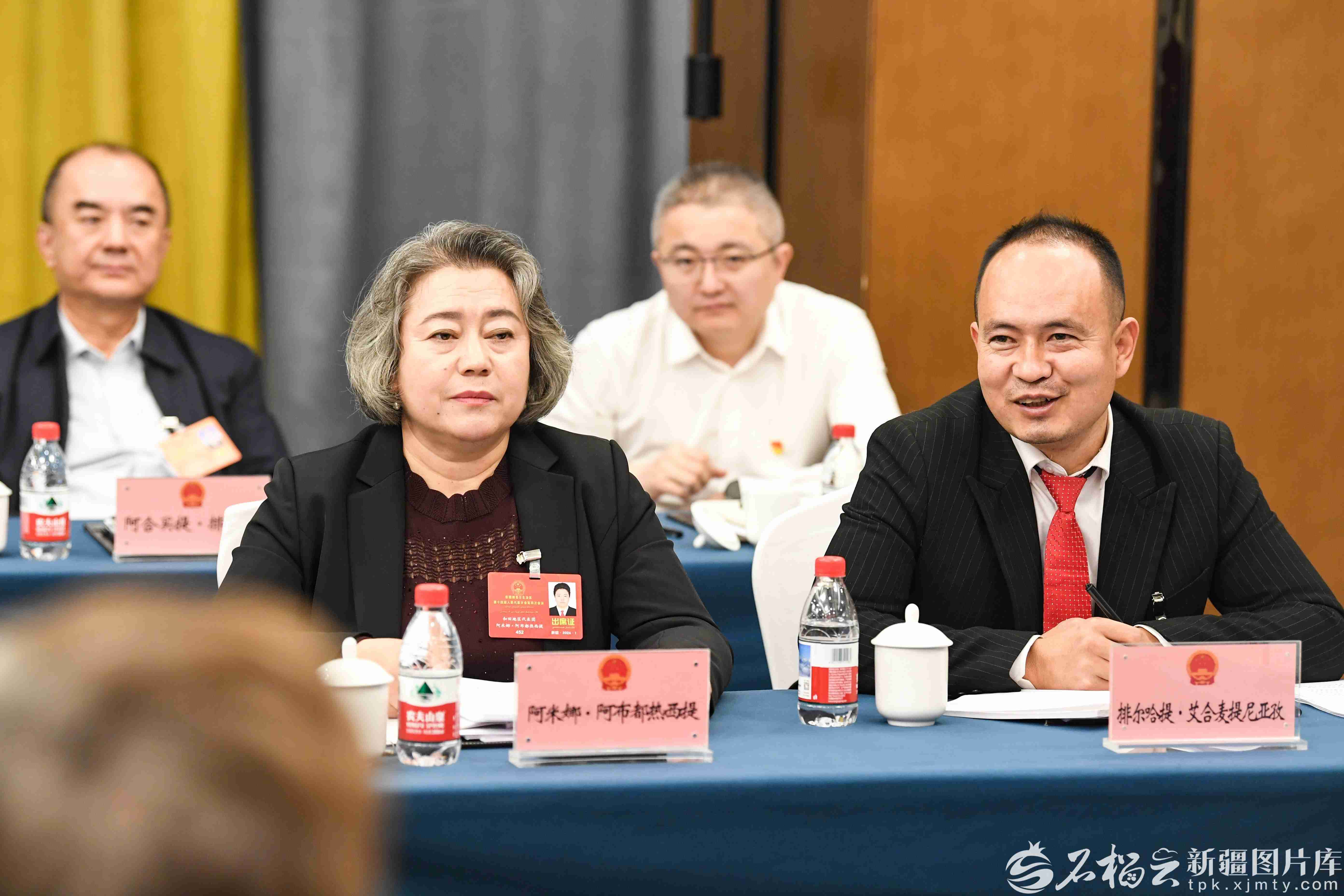 1月28日,排尔哈提·艾合麦提尼亚孜代表(右一)在参加和田地区代表团审议时,就坚持协调发展,促进乡村振兴等内容发言。天山网-新疆日报记者 汤永摄