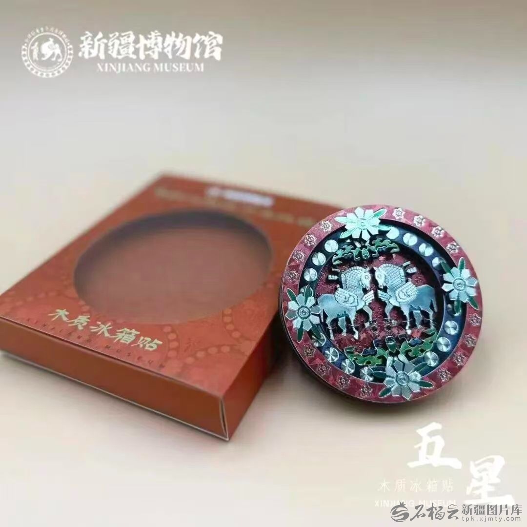 新疆博物馆文创区的“朱红地联珠对马文锦”木质冰箱贴。新疆博物馆文创区供图
