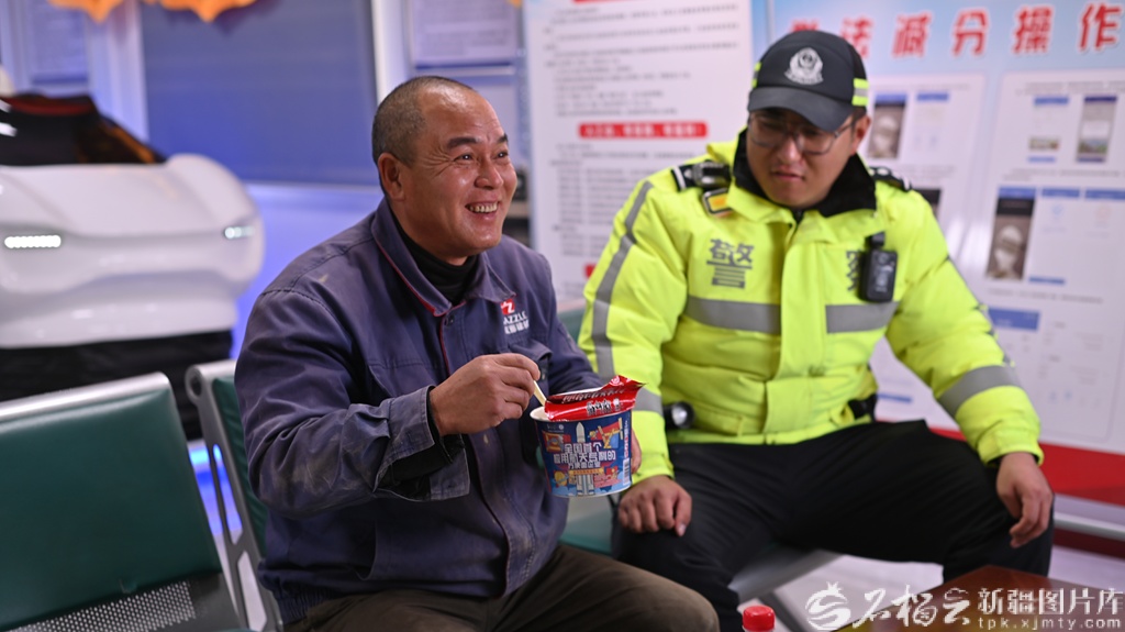 “师傅,喝杯热水暖暖,累了就停会儿,千万不能疲劳驾驶。”2月10日,库东公路124公里处巴音郭楞蒙古自治州塔里木公安局交通管理大队执勤岗亭,民警将一杯热水递到连续驾驶4小时的货车司机王师傅手中。面对因超速被查而情绪激动的驾驶人,民警也没有急于批评,而是一杯热水递过去、一碗泡面端上来,等对方情绪平复再耐心讲解法规。执法,既有力度又有温度。