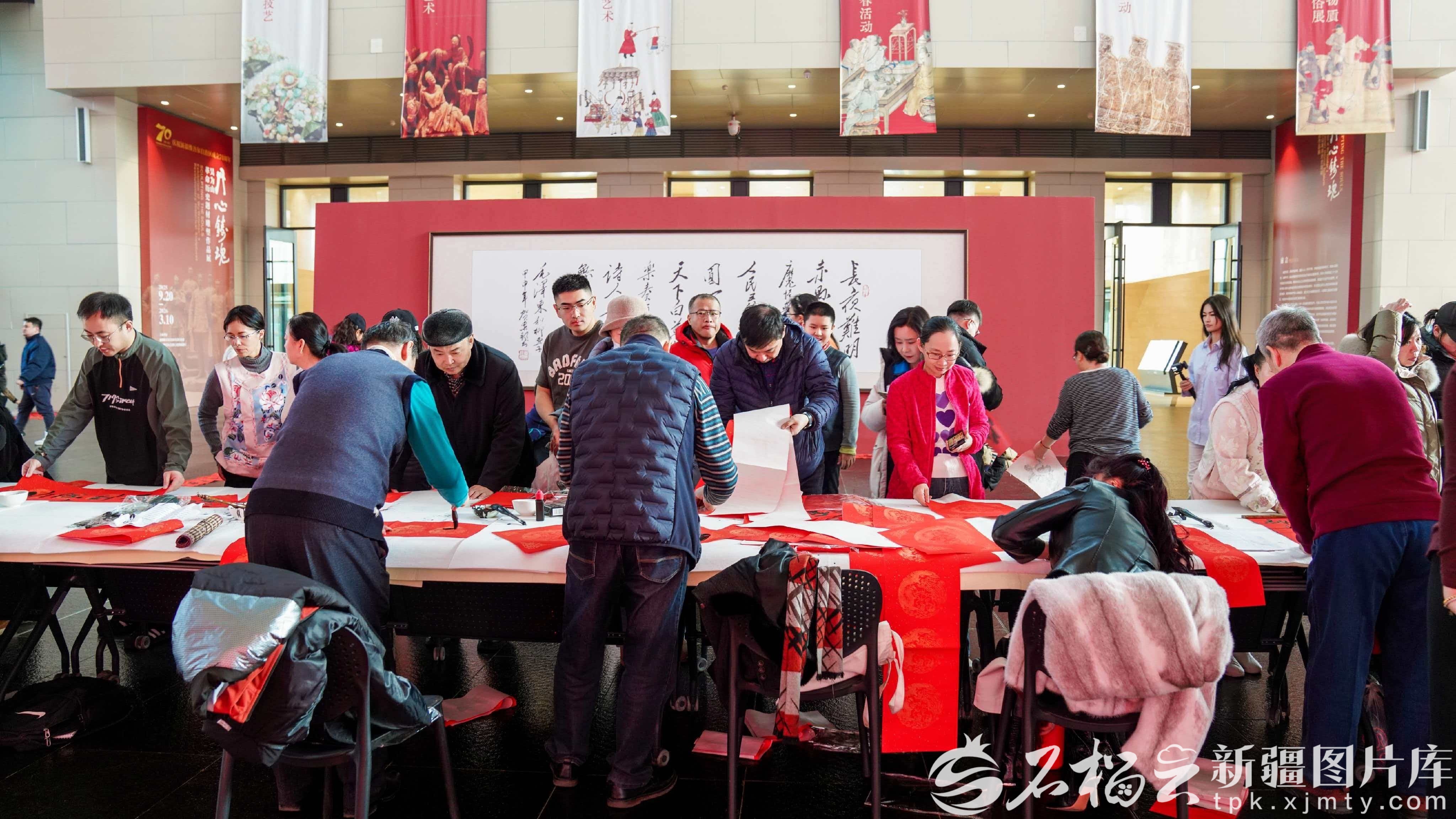 2月11日,活动在新疆美术馆举行专场,20名书法家现场为观众书写并赠送春联、“福”字300余副。“马蹄声声报春早,福字熠熠贺岁新”“骏影临笺气象新,春风入砚龙蛇舞”……一副副寓意吉祥的春联、一个个饱满有力的“福”字跃然纸上,字里行间年味浓厚,寄托着人们对国泰民安、家和业兴的美好祝愿。