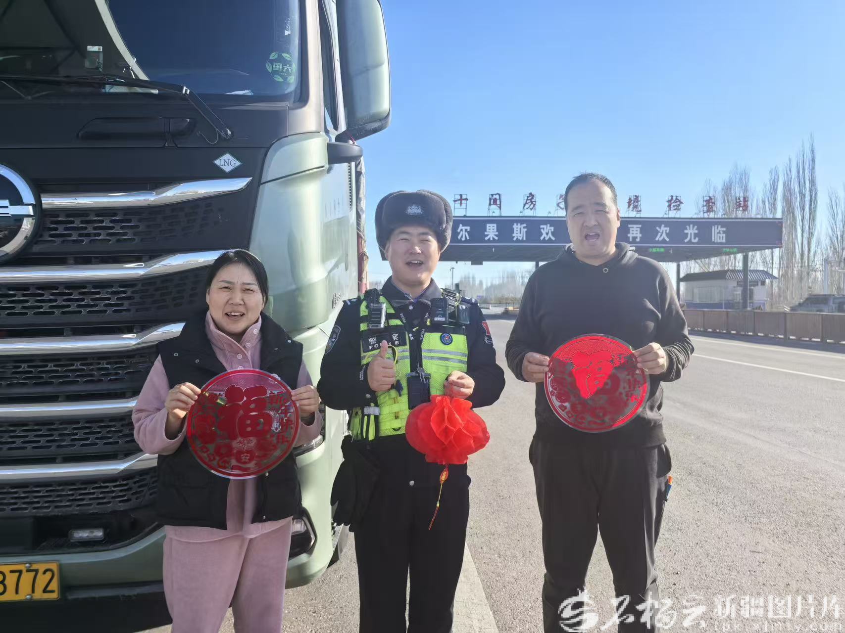 2月16日中午,王想鹏在八十间房子边境检查站为货车司机送上福字,一起庆贺新春佳节。王鹏飞摄