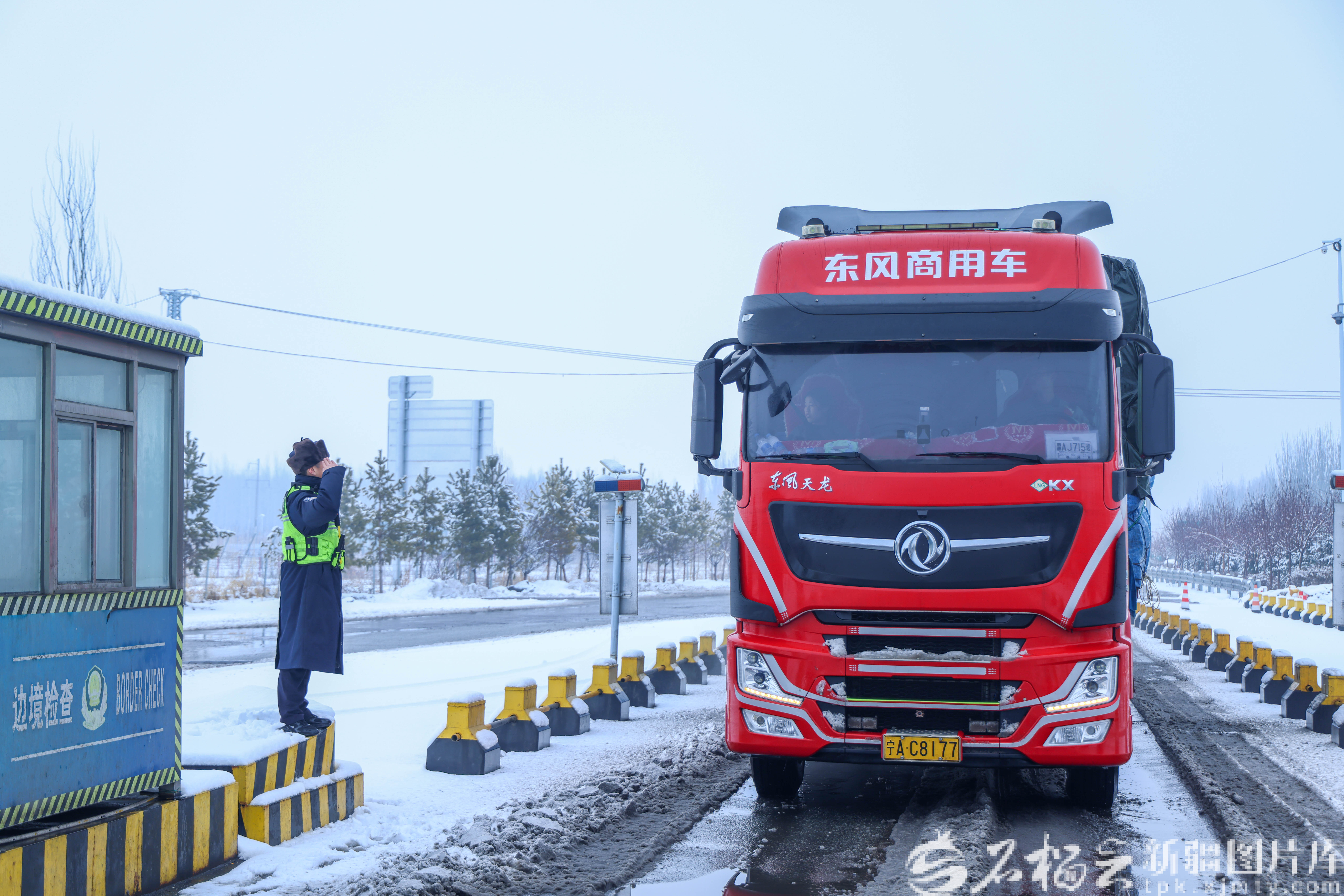 春节前夕,王想鹏在八十间房子边境检查站执勤时,向货车司机敬礼,快速查验后予以放行。王鹏飞摄
